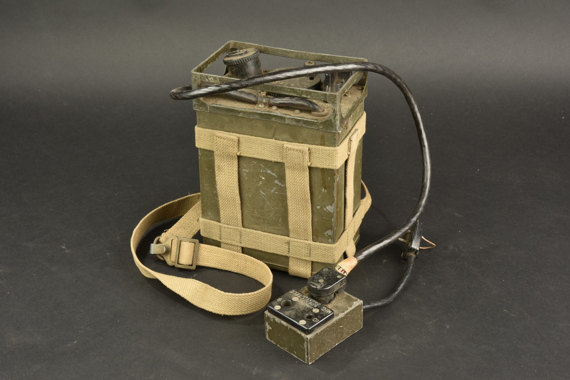 Wireless 38 MK 2. Boitier en métal, peinture kaki à 80%. Tous les boutons sont fonctionnels. L’appareil n’a pas été ouvert afin de vérifier les composants. Plaquette marquée Wireless set N°38 MK II ZA 13280 MW Serial N 112668. Câble et boitier de jonction présent. Celui-ci est bien marqué Junction Box N°2 ZA 13348. Prise présente. Certains câble sont dénudés. Harnais en toile web complet, fabrication SN LTD 1942, flèche du War Department présente. A noter une certaine usure et patine de la pièce. Etat II+.