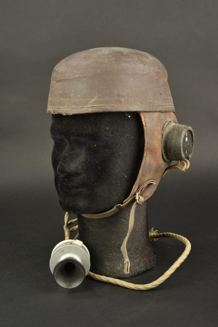 Casque de Glider britannique. Premier modèle. Coque en fibre agglomérée de couleur marron. Assemblée par rivetage. Les protèges oreilles sont en cuir marron. Doublure en peau de chamois.... en savoir plus