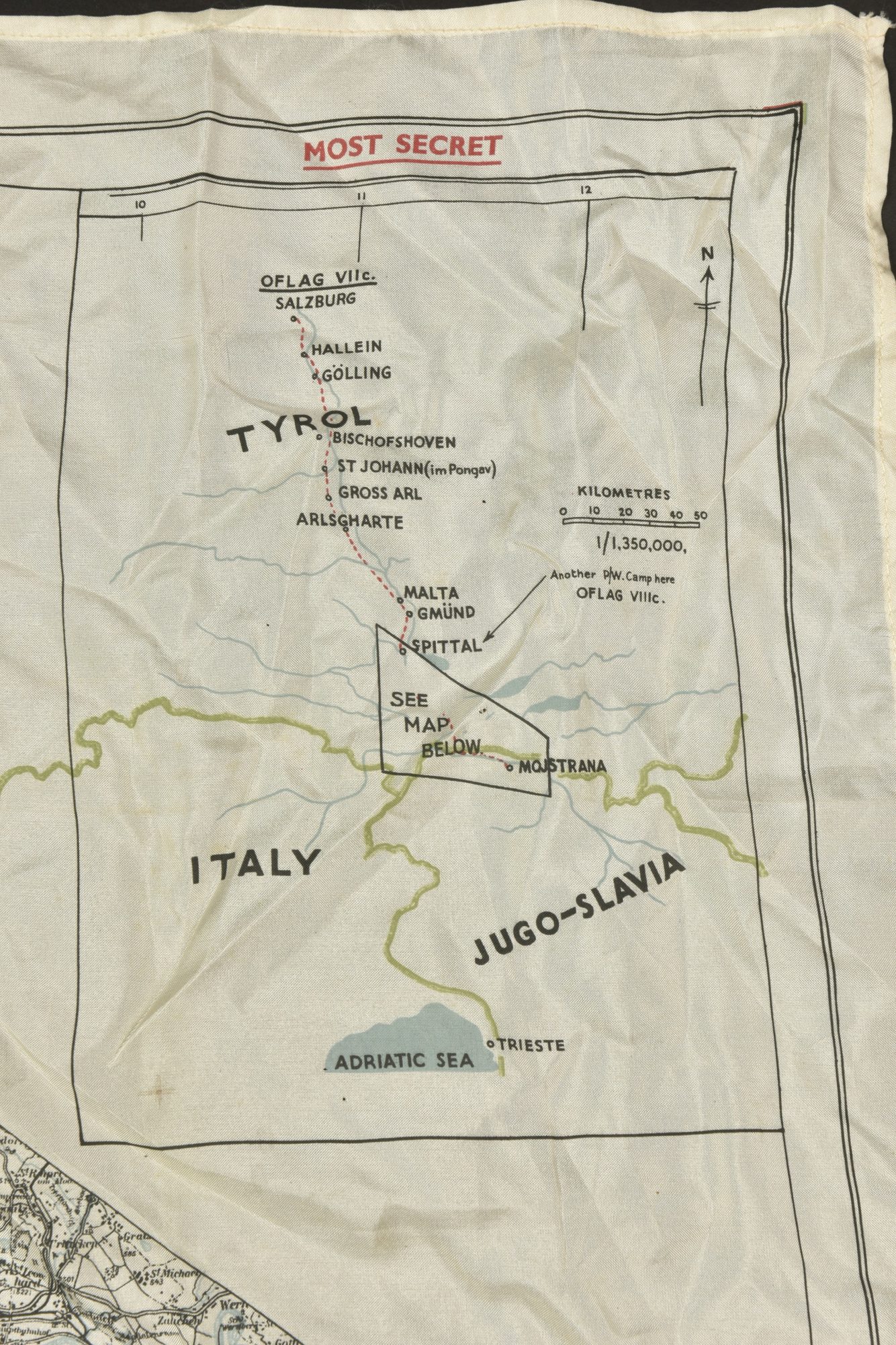 Carte d’évasion. En soie, représentant la zone Salzburg Mojstrana. Complète, mon face. A noter une certaine usure et patine de la pièce, ainsi que quelques tâches. Etat II+.