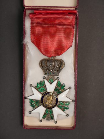 Croix de chevalier de la Légion d’Honneur, période 1830-1848, ou type 7. Avers buste d’Henri IV, Revers drapeux et devise Honneur et Patrie. En argent avec poinçon. Bélière Couronne articulée avec son ruban. Quelques sautes d’émail, ruban insolé. Boîte postérieure.