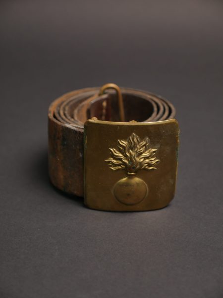 Plaque en laiton estampée à motif de grenade, plateau de 68 x 68 mm, marquée du fabricant G.B.F. à Paris. Arme à identifier Cavalerie, Infanterie légère ou Zouaves. Montée sur un ceinturon... en savoir plus