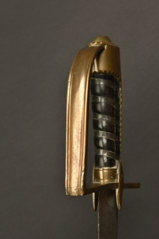Sabre de Hussard ou cavalerie légère style XVIIIe siècleSabre à monture laiton, calotte à longue queue dentelée, oreillons ovoïdes, arc de jointure à angle droit, croisière plate plus... en savoir plus