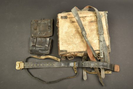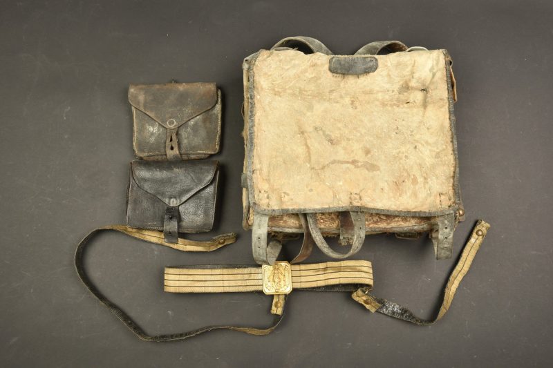 Ensemble d’équipements. Comprenant un havresac modèle 1864, confectionné en peau de veau, doublure écrue réceptionnée du 9-ème de ligne, les trois sangles permettant de fermer le sac... en savoir plus