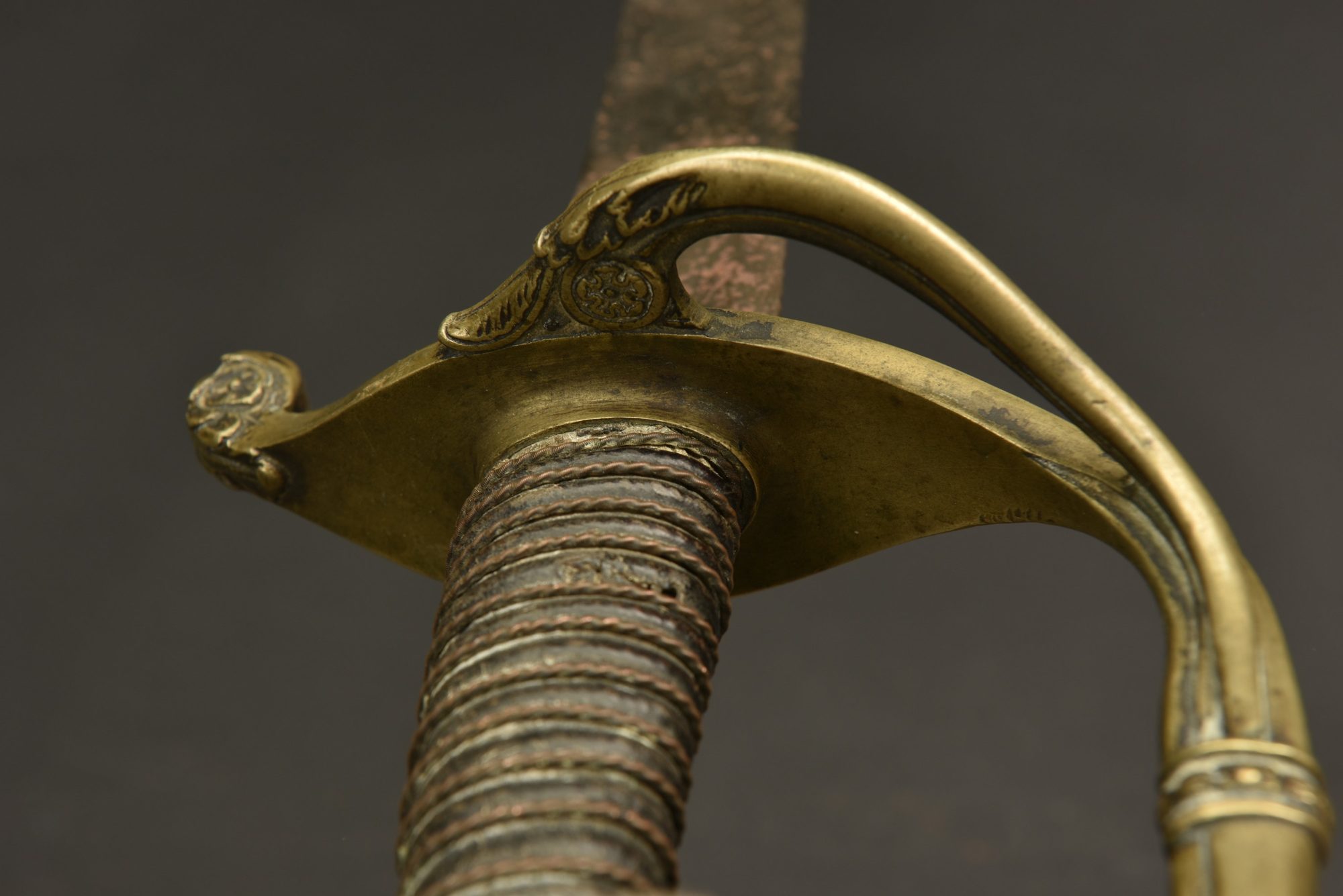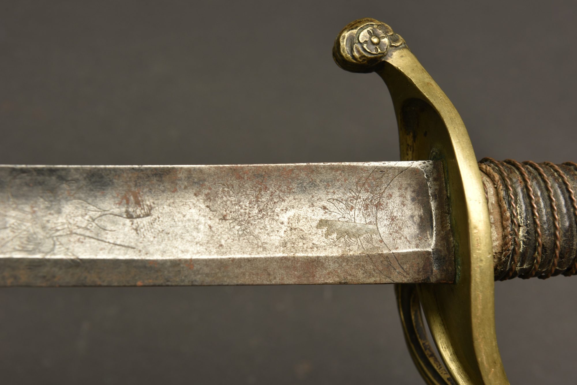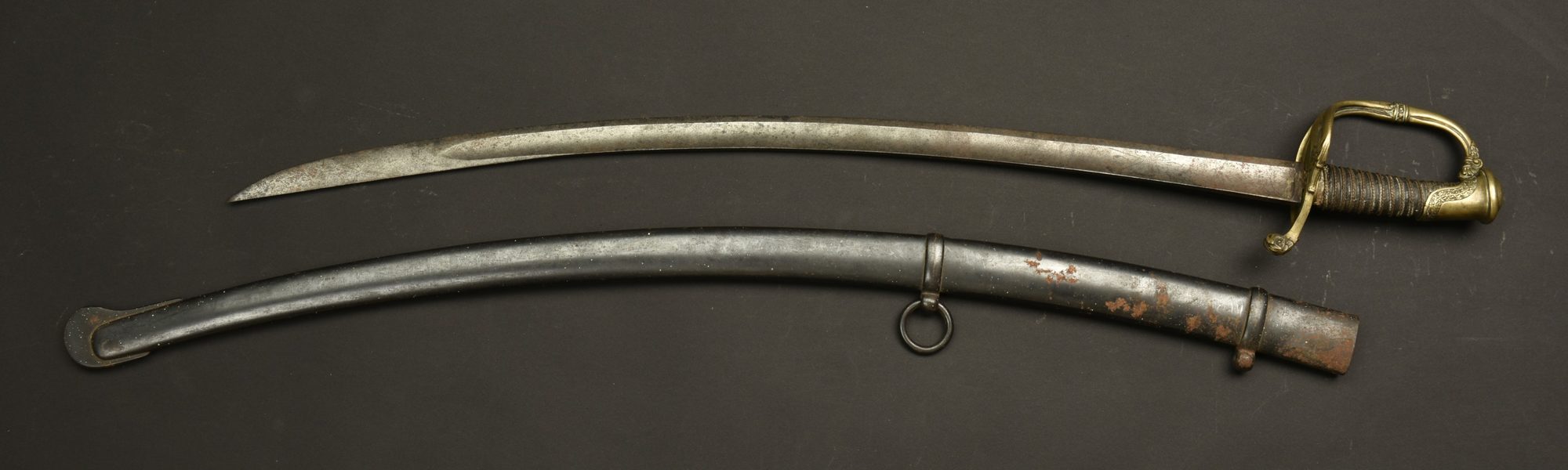 Sabre d’officier modèle 1821 et un fourreau acier de cavalerie ou artillerie. Monture laiton, poignée recouverte de basane avec filigrane. Lame à un pan et dos plat, avec restes de... en savoir plus