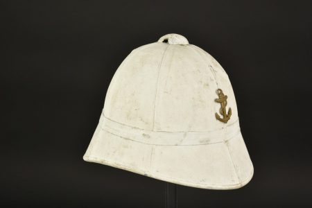 Casque colonial 1886 Infanterie coloniale. Modèle dit pain de sucre, en liège recouvert d’une toile blanche. Attribut frontal de l’infanterie coloniale. Doublure intérieure en tissu... en savoir plus