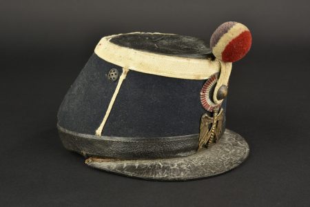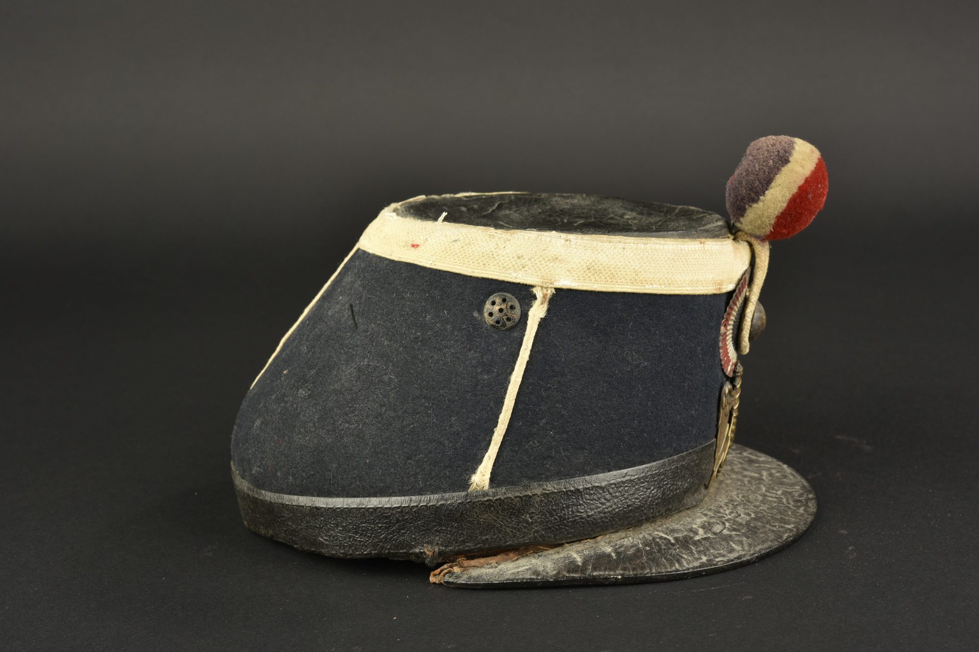 Shako de secrétaire d’état major. Fût en carton recouvert de drap bleu très foncé. Aérateurs laitons peints en noir. Bourdalou en cuir verni noir. Calotte en fort cuir noirci dont le... en savoir plus