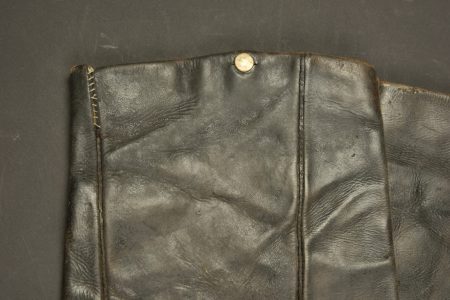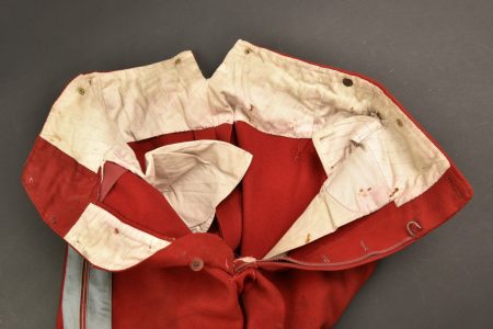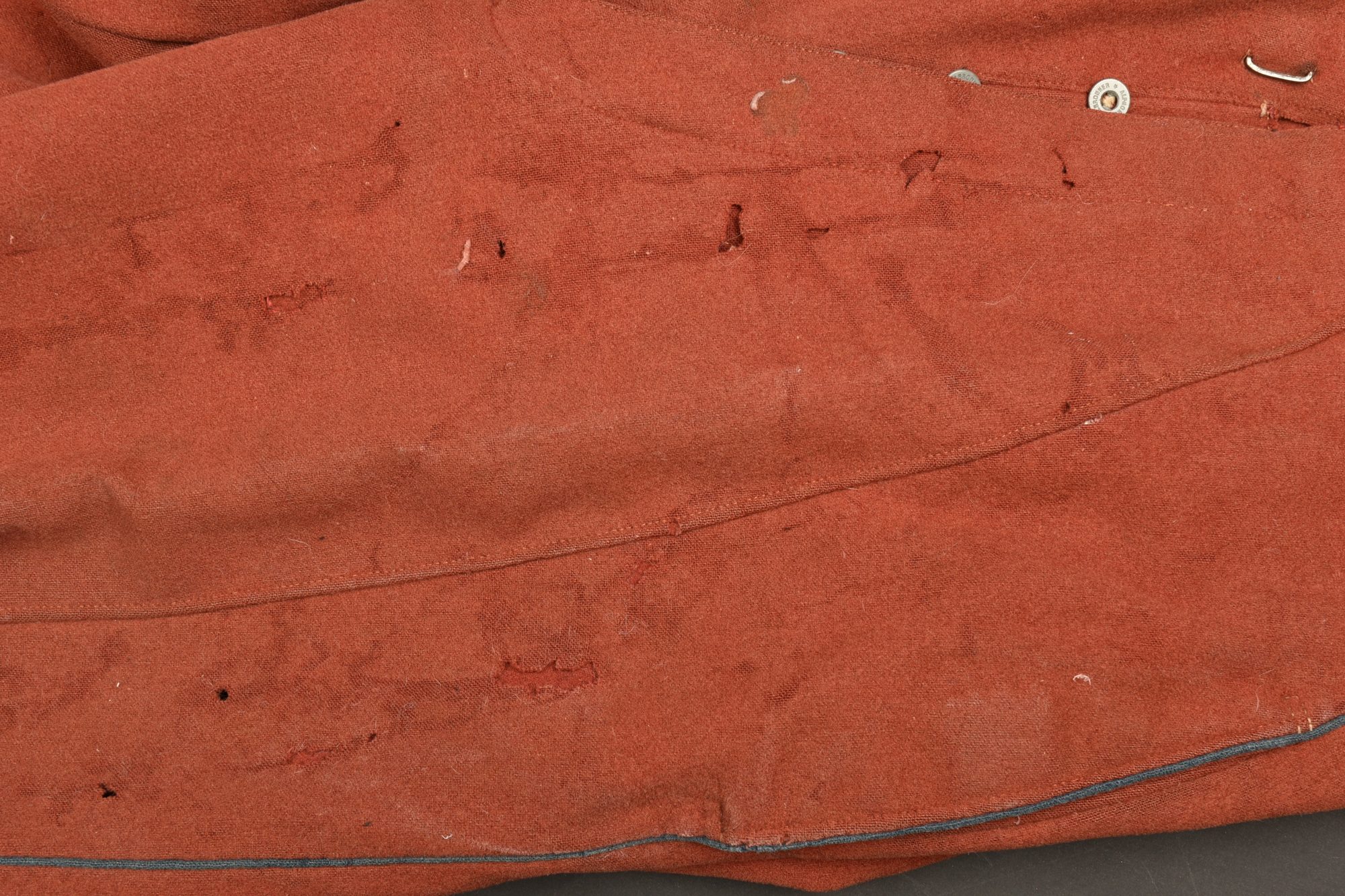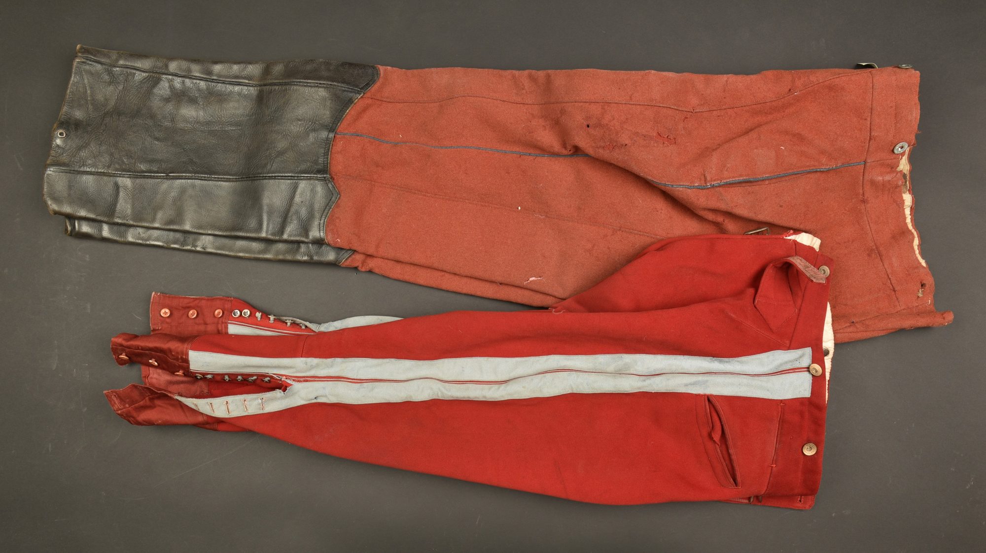 Pantalon à basane troupe et culotte d’officier de cavalerie légère. Pantalon en drap garance, jambes ornées d’un passepoil bleu de ciel et terminées par des basanes de cuir noirci. Renfort de fessier en drap du fond. Doublure coton ecru, divers tampons. Nombreux trous et léchures de mites, accrocs et réparations, notamment 2 pièces écarlates rajoutées au bas des ouvertures de poches. Usure d’usage et patine. Une culotte d’officier de cavalerie légère en fin drap garance, jambes garnies de 2 bandes et un passepoil bleu de ciel clair, manchettes fermant par 3 boutons. Trous et léchures de mites, accrocs et réparations, notamment 1 pièce écarlates rajoutées sur l’entre-jambes, usure et patine.