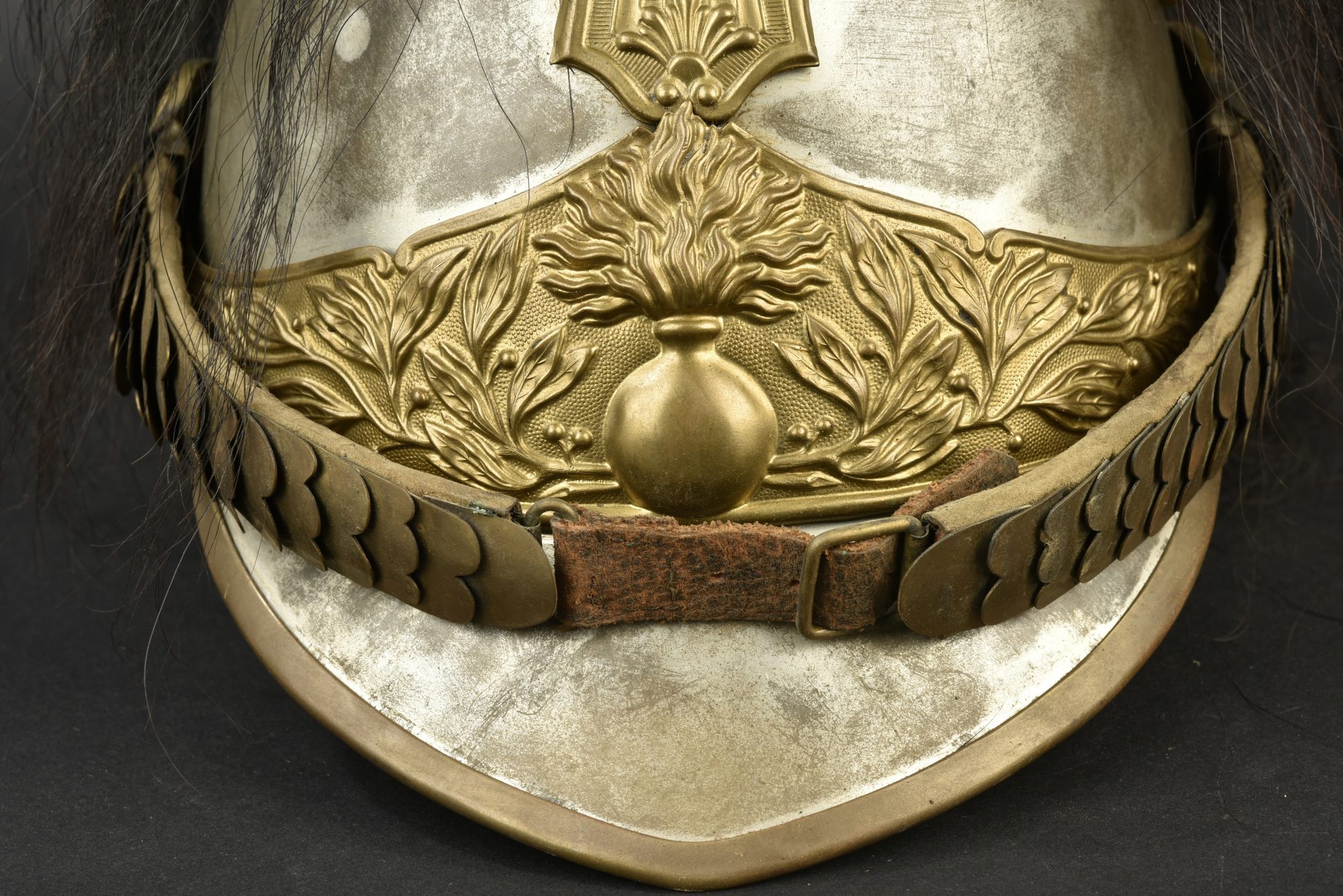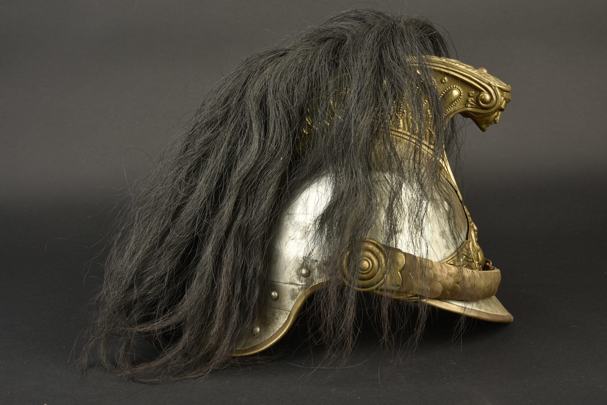 Casque de dragons 1874. Modèle pour sous officier, bombe nickelé marquée du fabricant Helbronner, garnitures en laiton, vis non d’origine, jugulaire complète, un ardillon est manquant.... en savoir plus
