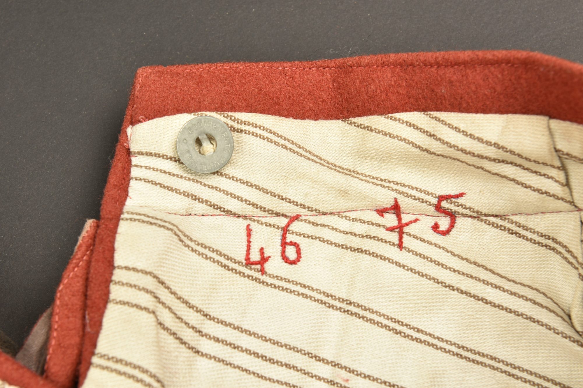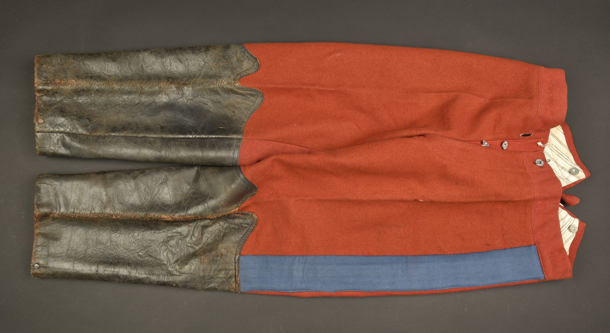 Pantalon à basane troupe de cavalerie légère. Beau pantalon en drap garance, jambes ornées d’une bande bleu de ciel foncé et terminées par des basanes de cuir noirci. Doublure coton... en savoir plus
