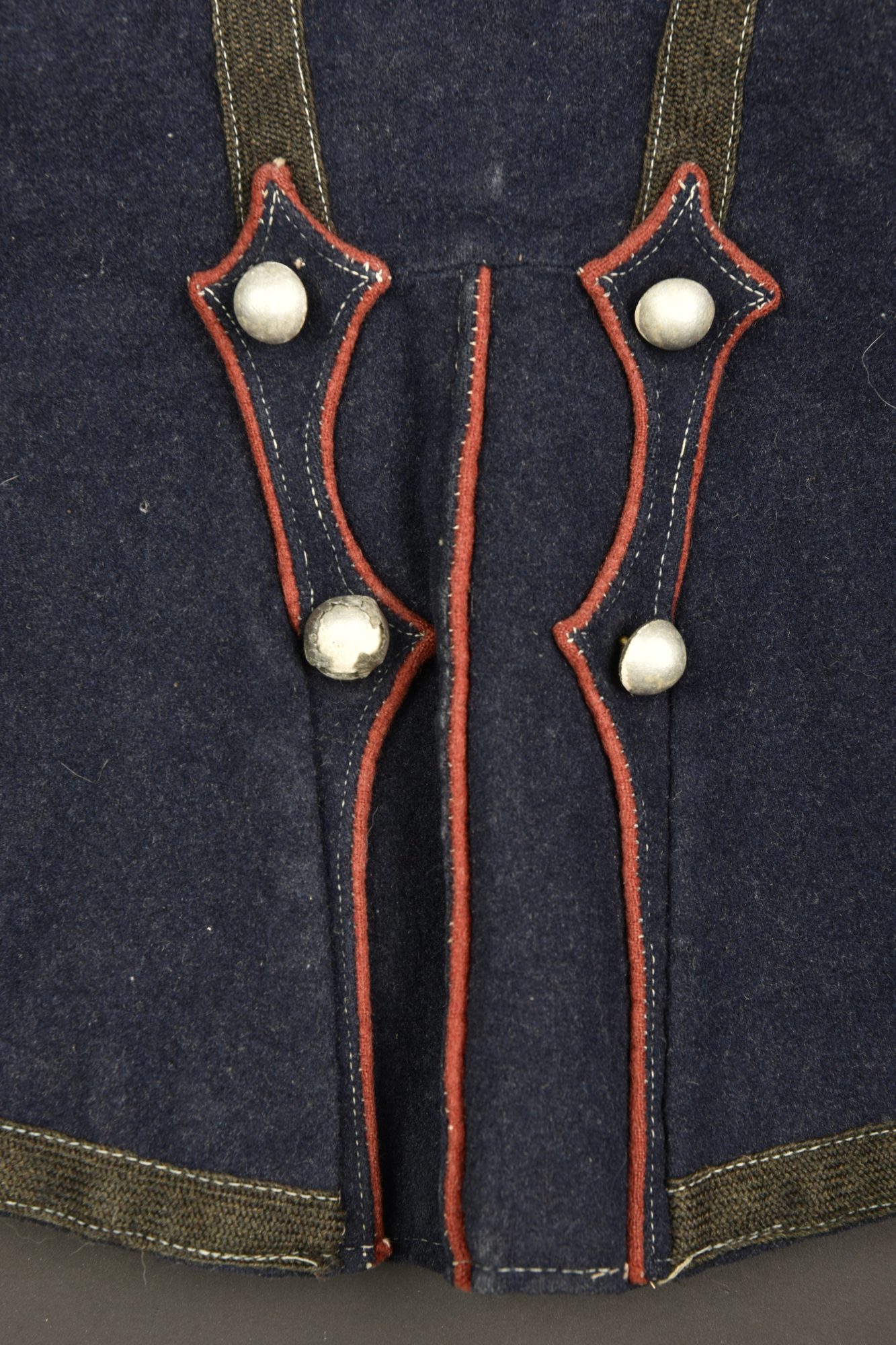 Dolman troupe Mle 1872 du Train des Equipages Militaires et accessoires. Dolman en drap gris de fer foncé fermant par 7 brandebourgs en tresse de poils de chèvres noirs. 3 rangées de boutons... en savoir plus