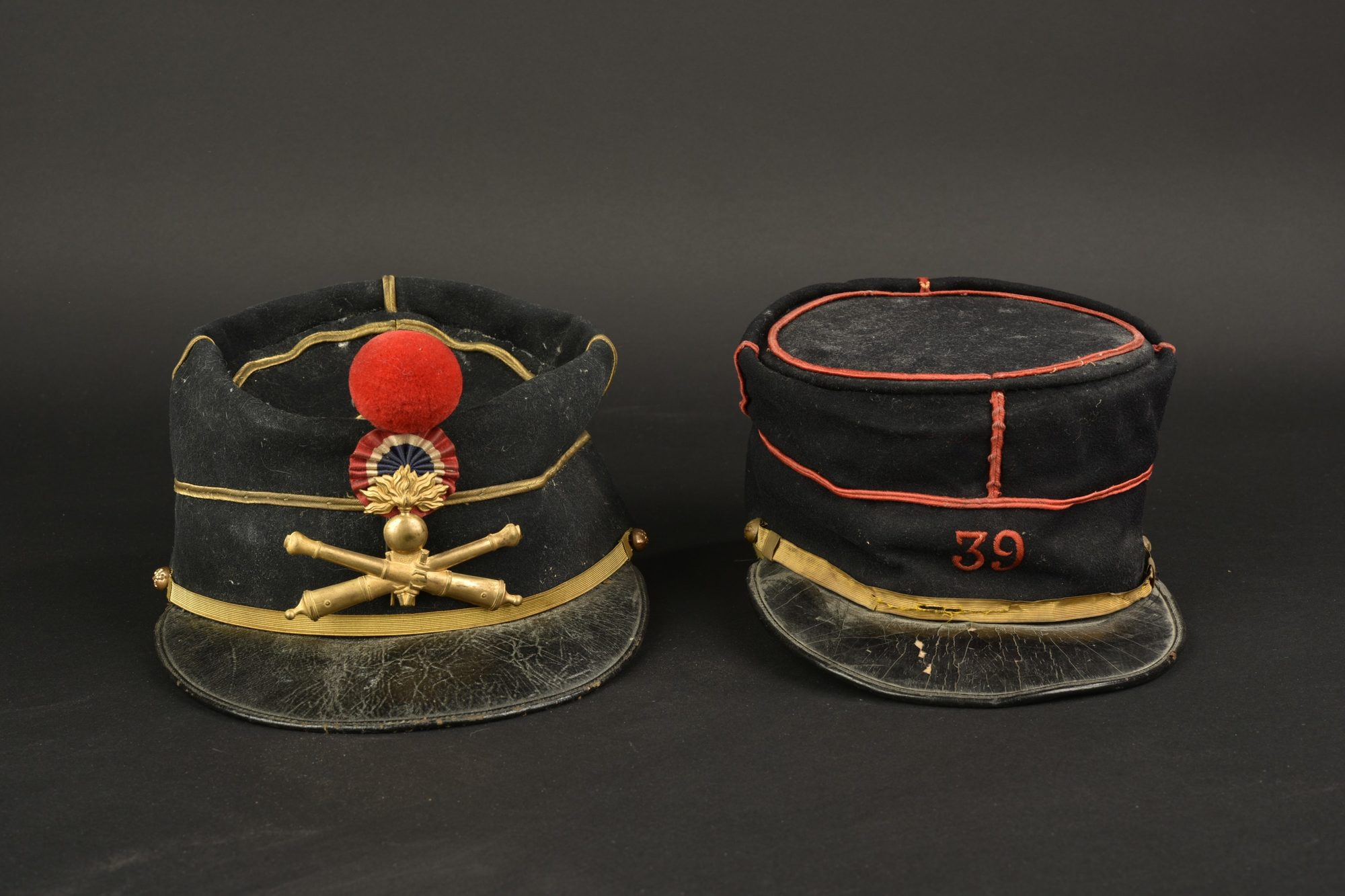 Ensemble de képis d’artillerie. Comprenant un képi foulard sous lieutenant d’artillerie. Confectionné en drap noir, galons dorés, fausse jugulaire dorée, boutons aux armes de l’artillerie. Visière en cuir doublée ne maroquin vert, bandeau en cuir possédant une bordure dorée ainsi que le tampon du tailleur Mirou à Lille. Doublure en soie rouge possédant deux tampons. On y joint un attribut d’artillerie avec cocarde tressée et pompon écarlate. Un képi polo en drap noir, passepoil écarlate, fausse jugulaire dorée abimée, chiffre 39 au fil de coton écarlate, visière en cuir, boutons d’artillerie, bandeau en cuir. Etat II+