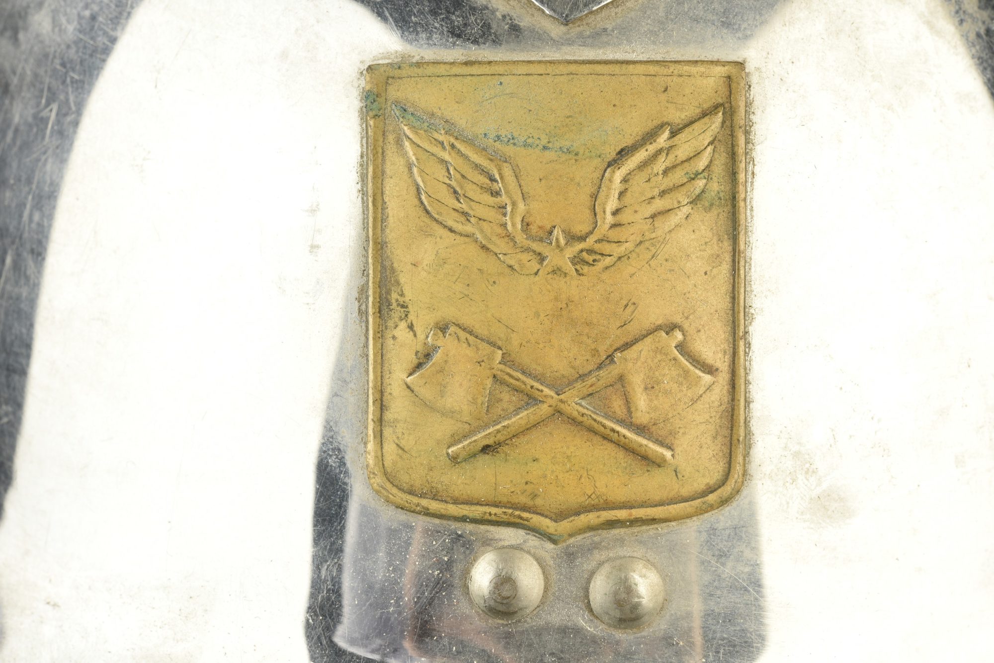 Casque 1933 pompiers aviation. Modèle 1933 entièrement chromé, jonc en laiton, grenade rapportée sur le cimier. Attribut en laiton en forme d’écu possédant l’insigne spécifique à l’aviation légère. Coiffe en cuir dont avec une agrafe réparée et une absente. Numéro 51 dans la nuquière. Etat II+