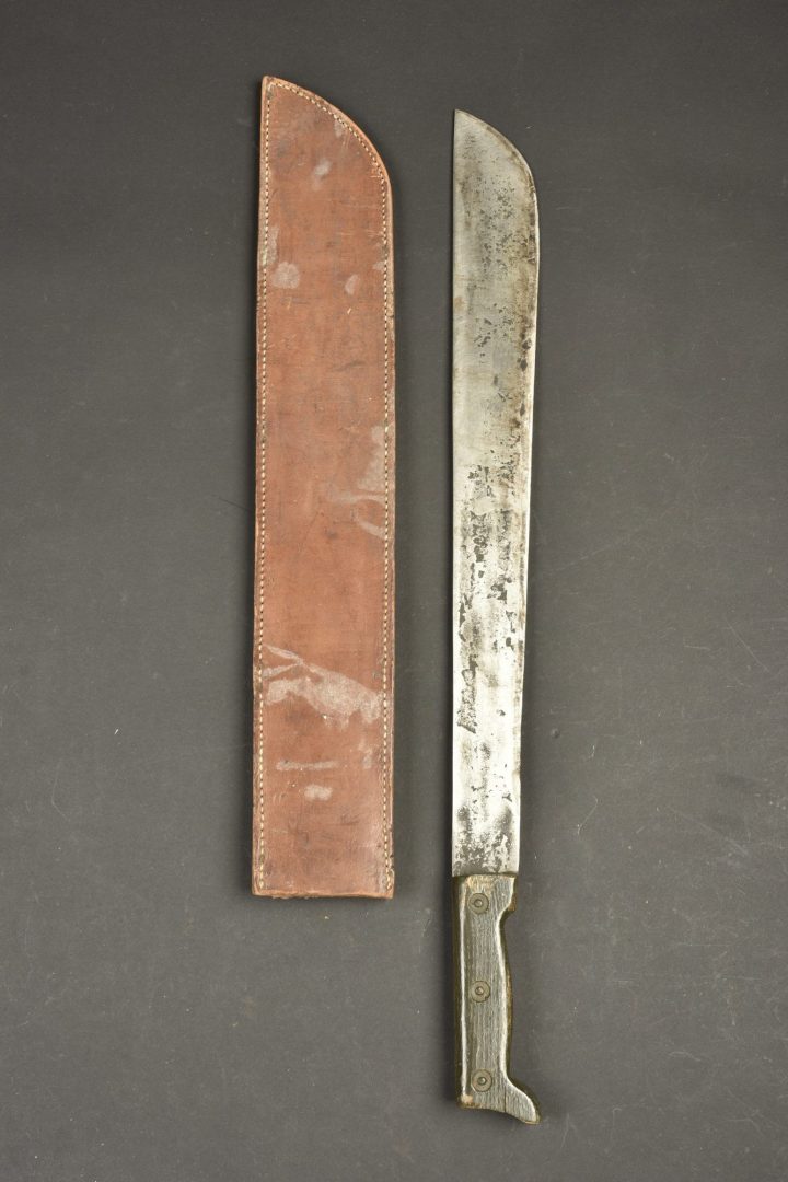 Machette britannique. Plaquettes en bois maintenues par 3 rivets. Cordon en cuir complet. Lame fortement usée, polie, meulée, et oxydée, sans marquages visibles. Fourreau en épais cuir marron.... en savoir plus