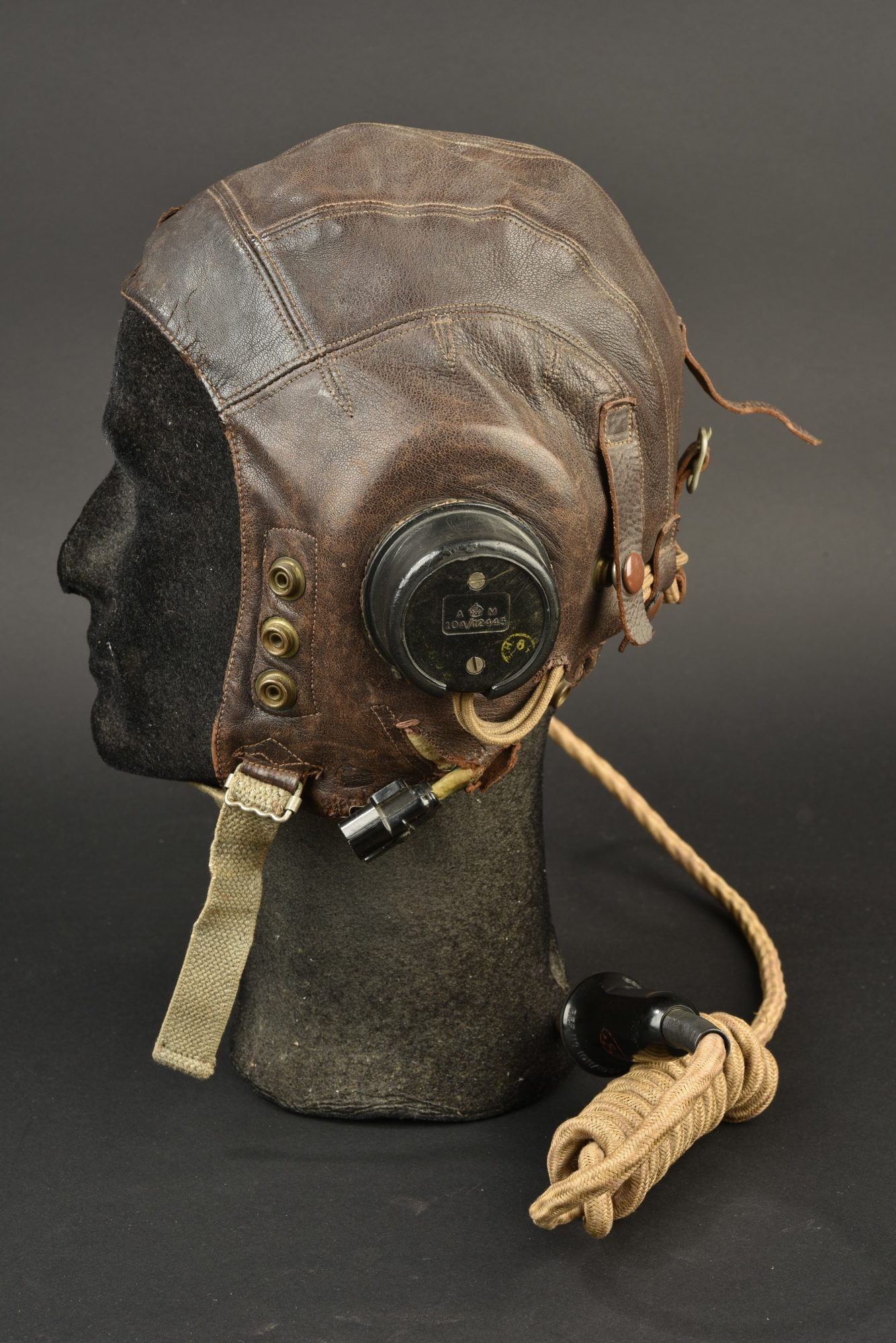 Bonnet de vol RAF. En cuir marron. Tous les boutons pression sont fonctionnels. Intérieur doublé en peau de chamois. Ecouteurs 10A 12443 présent dans leur logement en caoutchouc noir.... en savoir plus