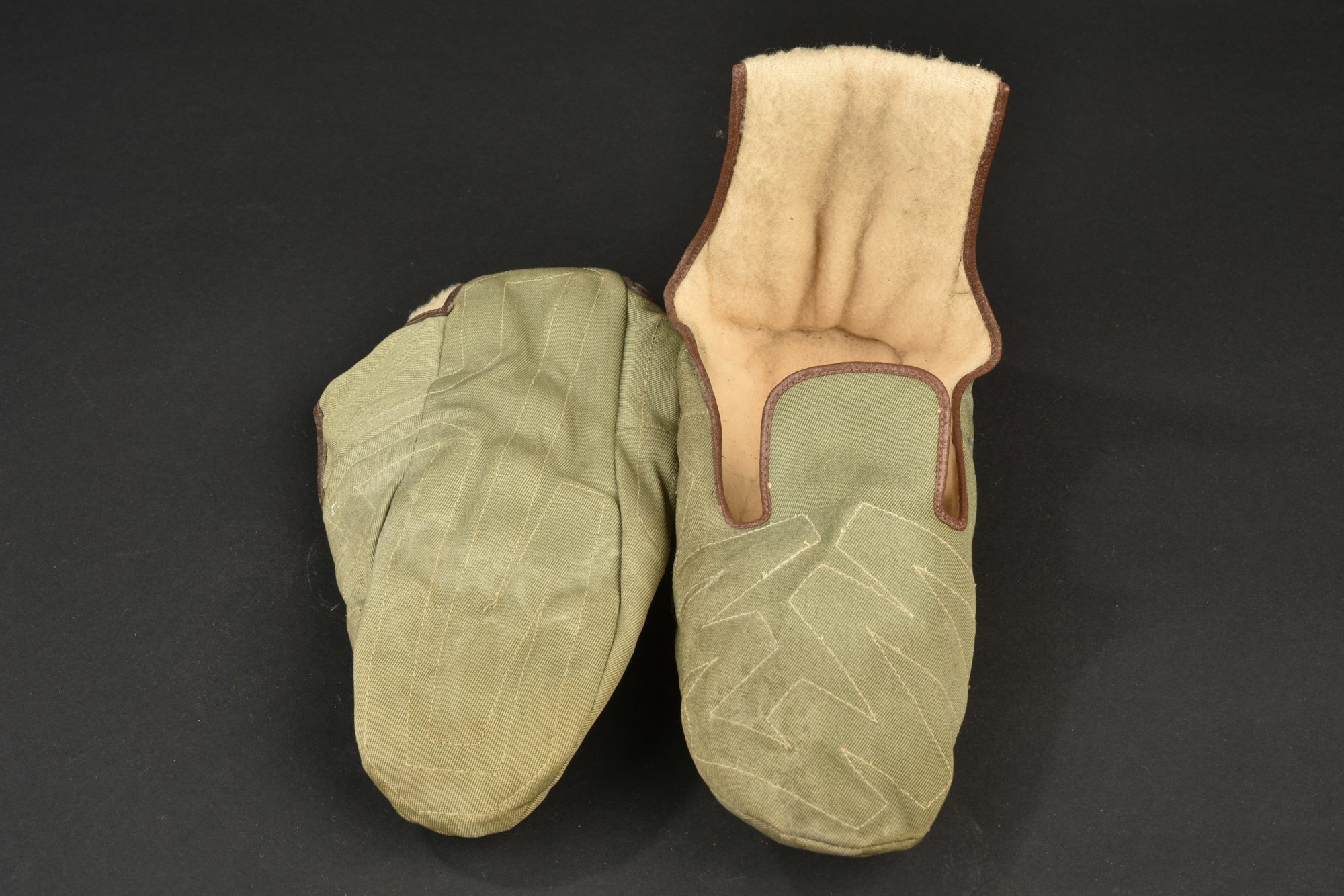 Chaussons RAF. En tissu kaki, intérieur doublé en feutrine blanche. Tous les boutons pression sont fonctionnels. Etiquette du tailleur Windak. Etiquette avec AM sous couronne. A noter une... en savoir plus