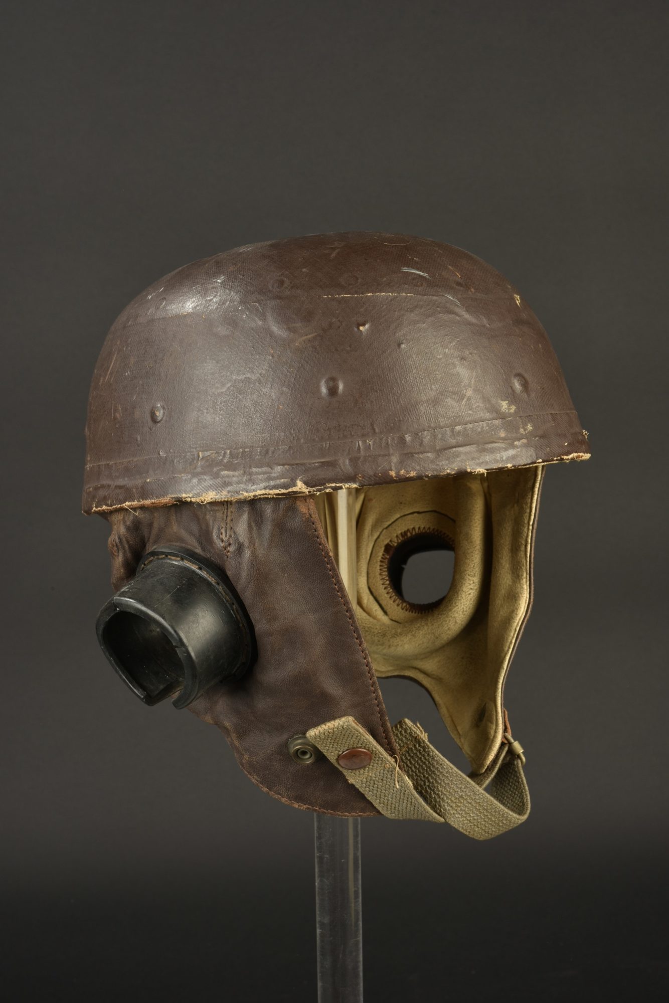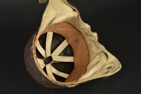 Casque de glider britannique. Coque en fibre de couleur marron. Les bordures sont très usées. Coiffe interne complète. Bandeau de sudation en cuir fauve. Le cordon de serrage est présent, mais... en savoir plus