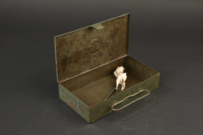 Boite d’accessoires de nettoyage de Colt 45. Boite en métal. Peinture kaki à 50%. Beau marquage US sur le couvercle. Poignée de transport présente. Marquage 10 15 Cm à la peinture rouge... en savoir plus