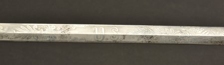 épée d’officier US modèle 1860. Monture laiton moulée à un quillon, pommeau à l’aigle américain. Clavier à l’aigle sur fond de drapeaux, contre clavier articulé avec gravure du nom George H. Gifford. Poignée galuchat avec filigrane, un fil coupé et détendu. Lame à 2 pans du fabricant Forstmann à Philadelphie, gravée d’un côté des lettres U.S. et de l’autre de l’aigle avec écu aux motif du drapeau américain, avec des motifs végétaux. Fourreau acier à 2 bracelets de laiton ciselés de feuilles, le plus haut à deux anneaux, le bas à un seul. Chape et bouterolle rapportés, en laiton. Usure d’usage et patine