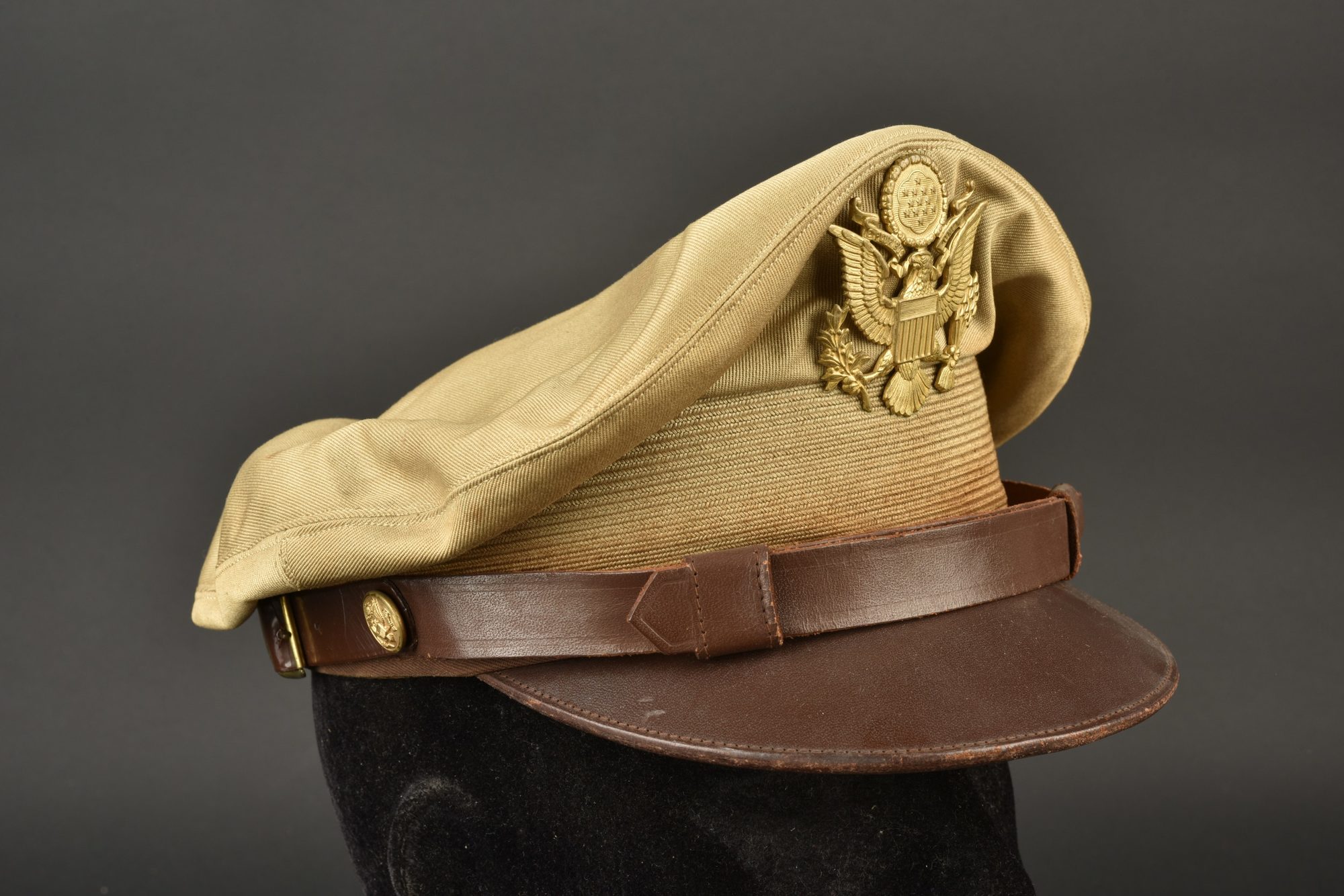 Casquette d’officier US. Coiffe en tissu chino. Insigne d’officier en métal doré. Bandeau en mohair beige. Visière en cuir marron, relativement souple. Fausse jugulaire en cuir marron. Intérieur ne disposant pas de doublure. Laundry number H-2140 tamponné au fond de la coiffure. Bandeau de transpiration en cuir marron, Taille 6 7/8. Indication nominative illisible sur le bandeau de sudation. Marquages sous le bandeau, ceux-ci sont partiellement illisibles. Datée 43 ou 48. A noter une certaine usure et patine de la pièce, ainsi que quelques tâches. Etat II+.