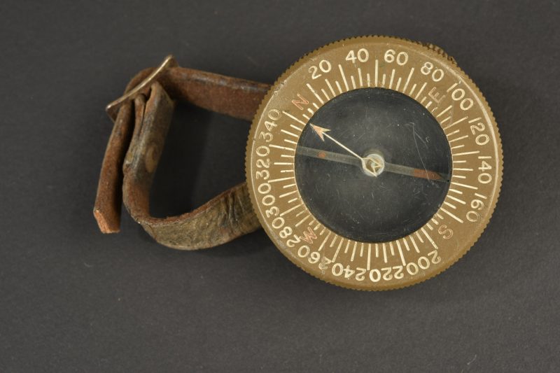 Boussole de poignée. En bakélite marron. Fond noir. Fonctionnelle. Marquages au dos Corps of Engineers US Army. Fabrication Superior Magneto Corps LI City NY. Bracelet en cuir non... en savoir plus