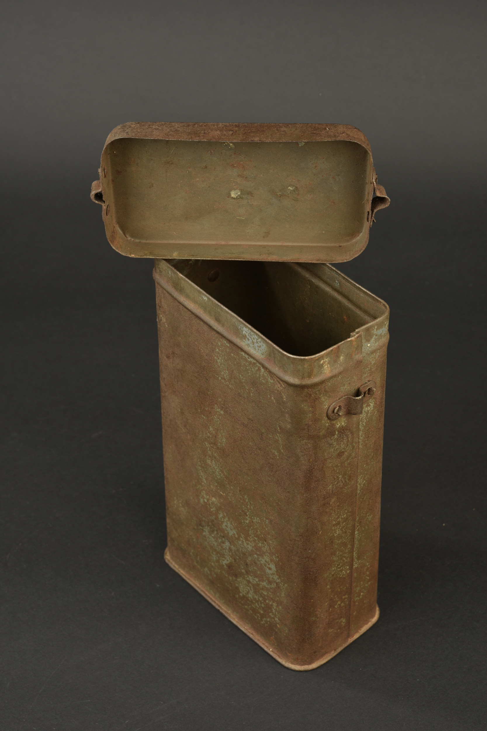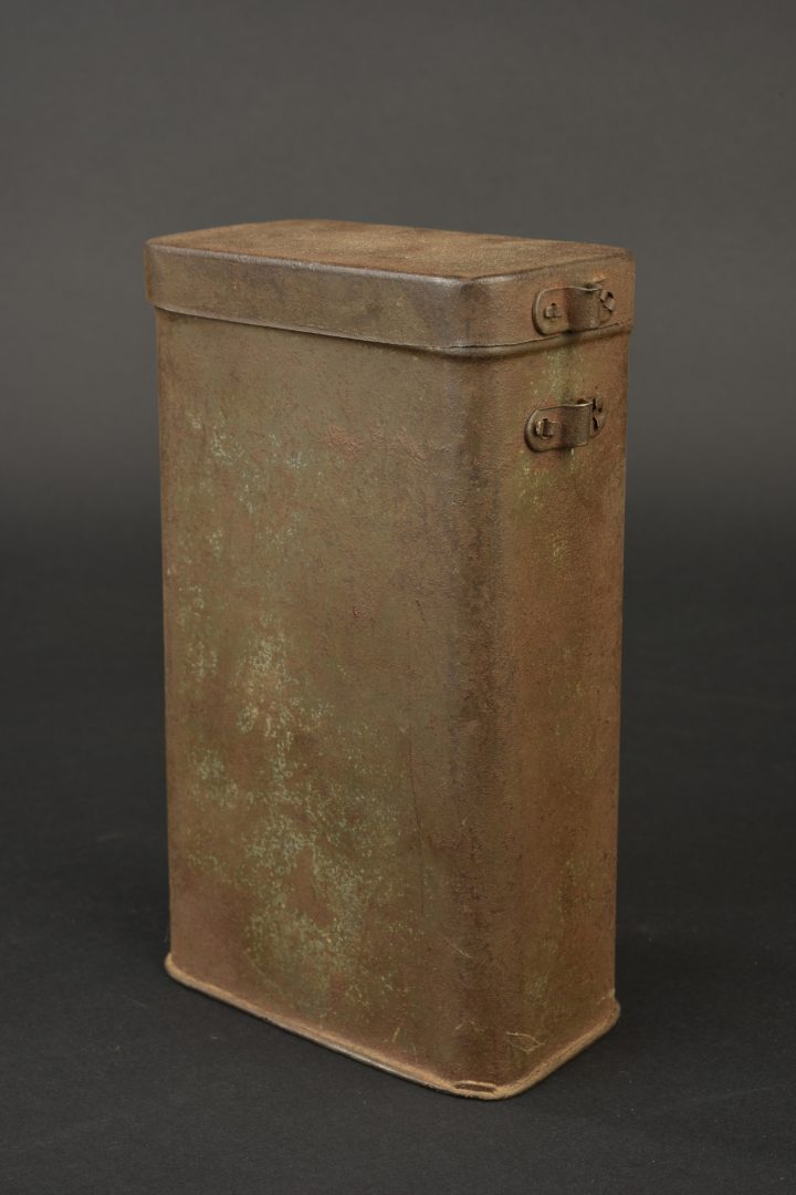 Boite de masque anti gaz M2. En métal, restes de peinture bleu horizon.