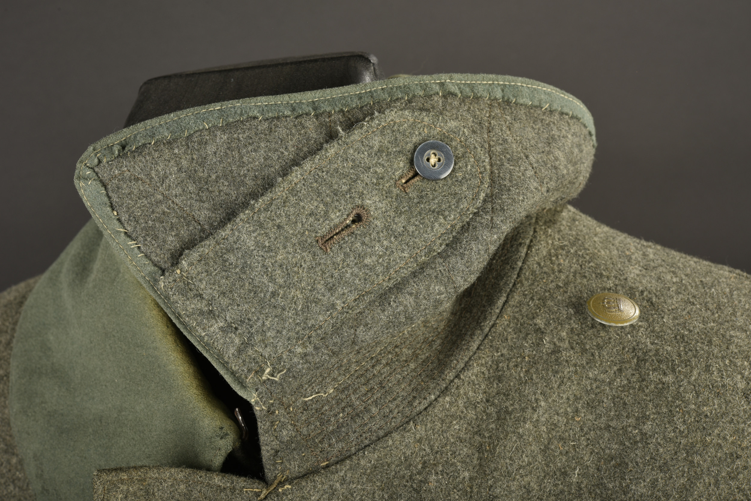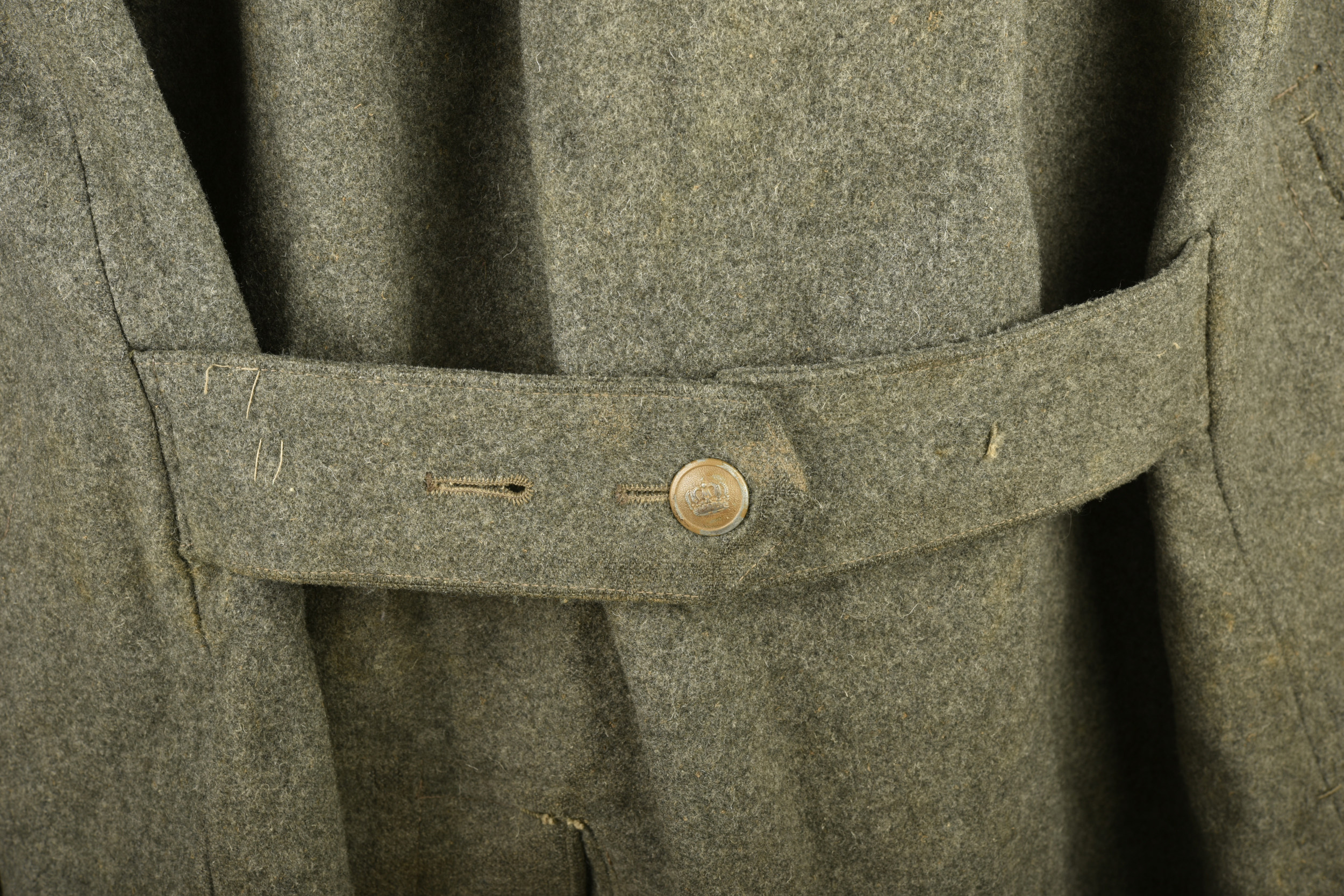 Manteau allemand modèle 1915. En drap feldgrau, col vert, fermant par six boutons à la couronne, doublure en coton gris. Marquage du BA XV daté 1918. A noter plusieurs trous de mites.