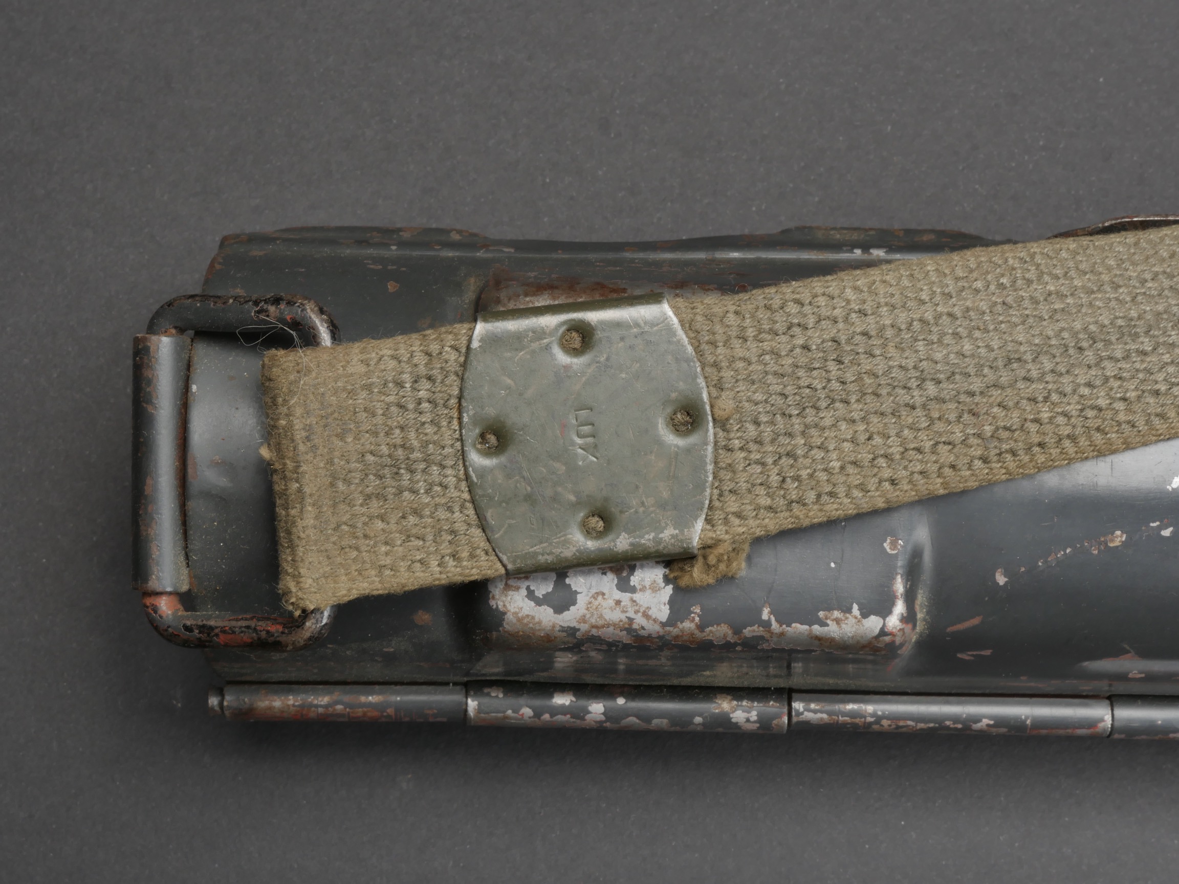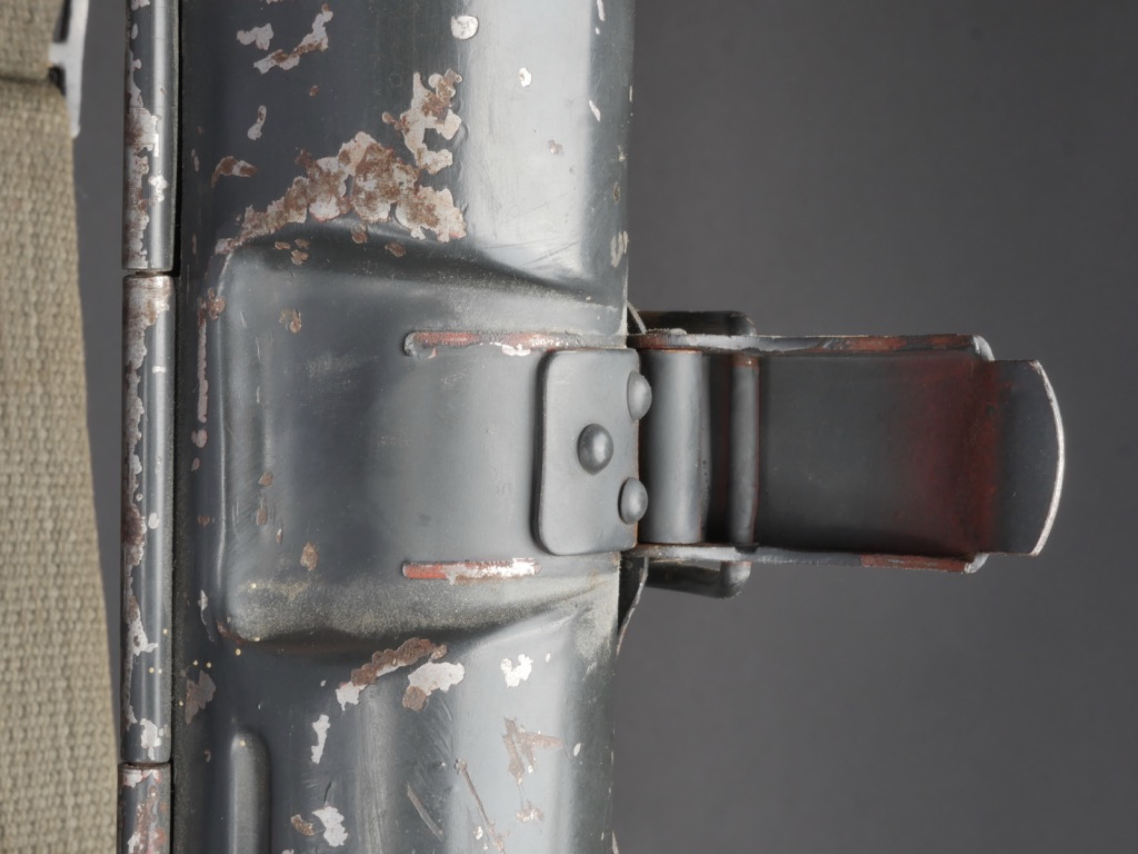 Porte canon MG34/42. Peinture jaune bleue à 85%, marquage laufschützer 43, fabricant brc 43. Sangle de transport en toile d’origine, parties métalliques marquées Lux. Etat II+