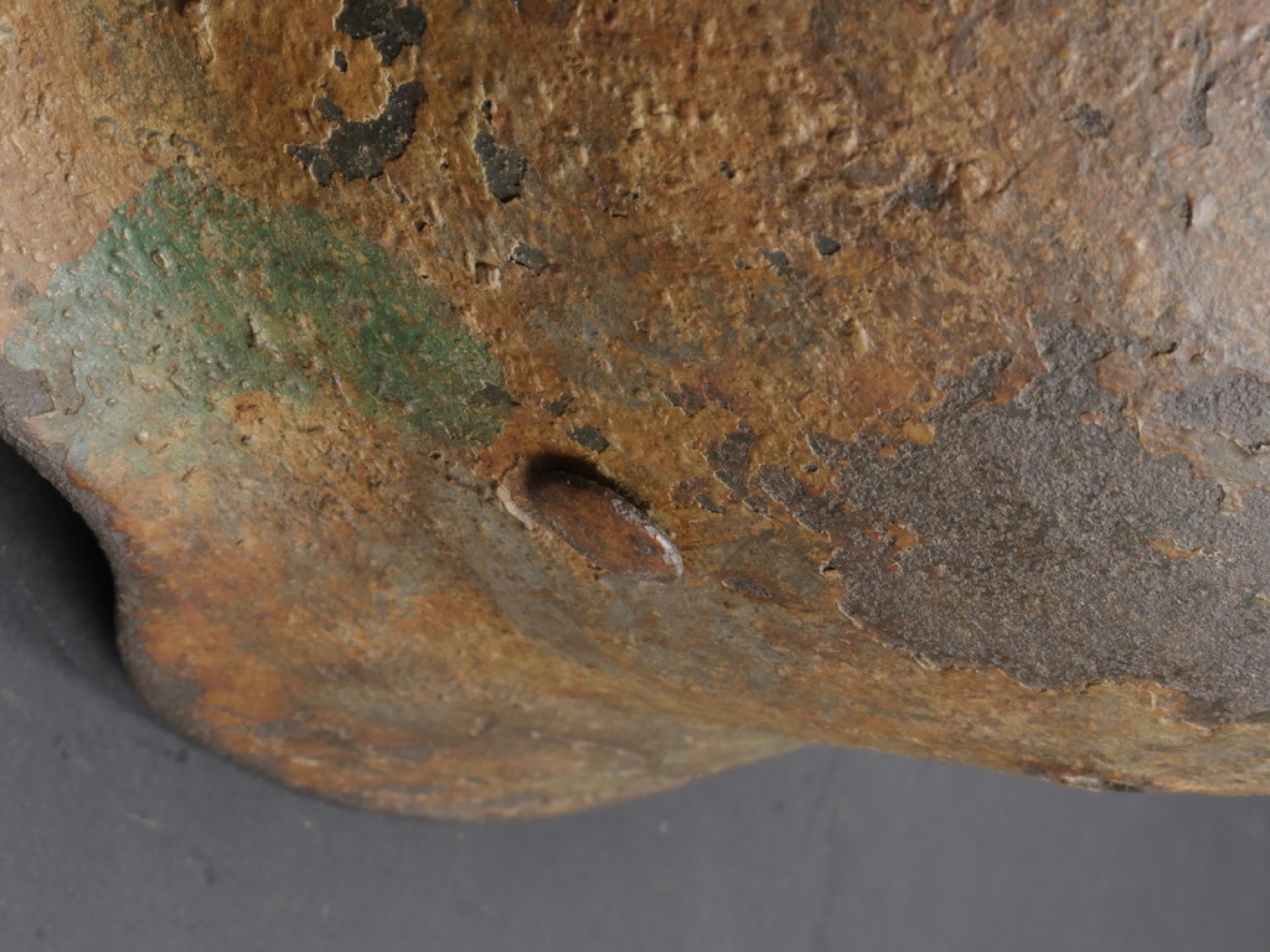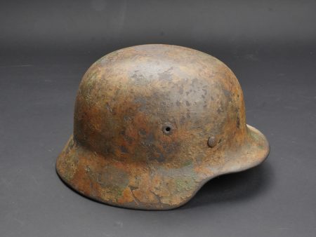 Casque allemand M40 Heer camouflé trois tons. Casque modèle 1940, les marquages de coque sont illisibles. Peinture de camouflage texturée trois tons sable, vert et gris présente à 85%.... en savoir plus