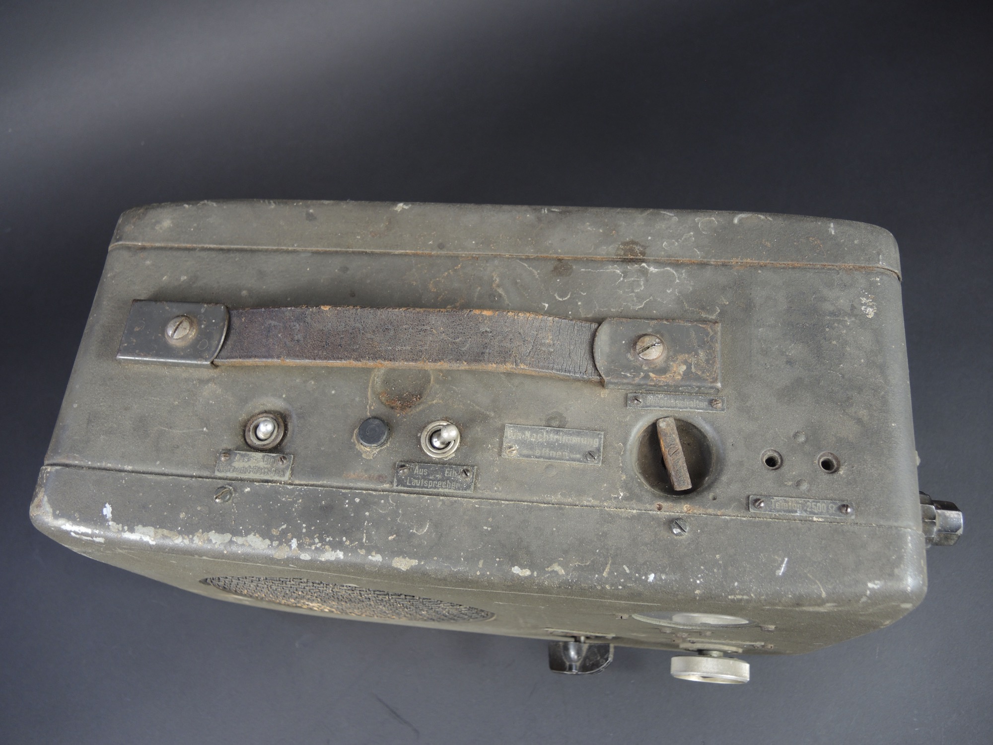 Radio allemande à ondes courtes type R3. Radio de 24 Volt, plaquette constructeur difficilement lisible hormis le type R3. Caisse en peinture verte d’origine à près de 90%, tous les boutons semblent fonctionnels. Poignée en cuir présente et marquée R3 110 220 24V. Etat II+