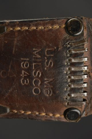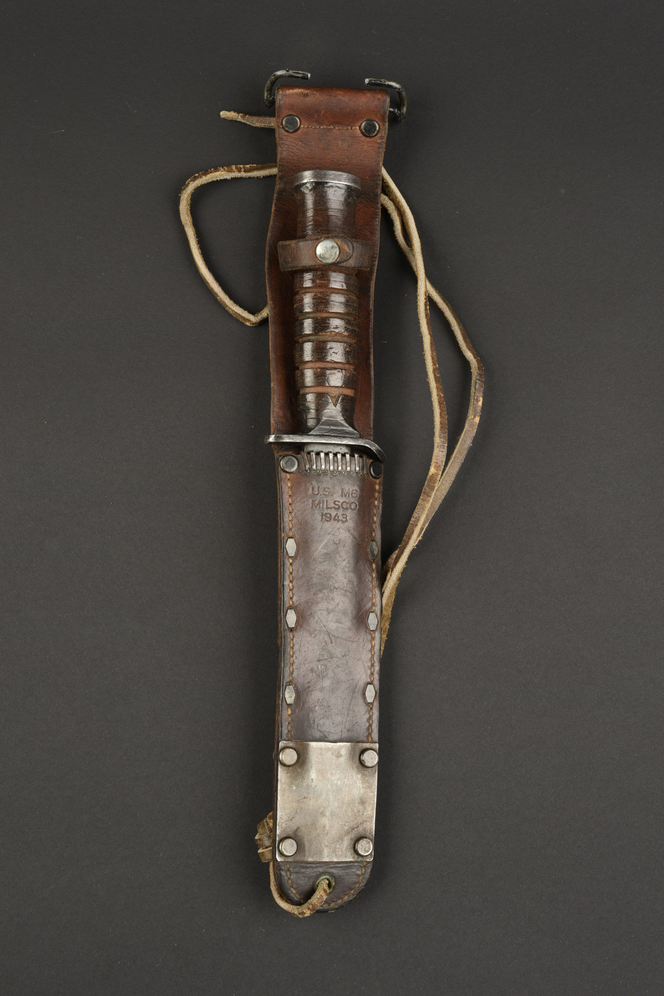 Couteau USM3 et fourreau USM6. Couteau USM3, manche composé d’anneaux en cuir, grenade de l’intendance absente sur le pommeau. Lame dans sa couleur d’origine à 40% et marquée US M3 Case 1943. Durant la guerre ce fabricant produira 300 465 exemplaires du M3. Fourreau USM6 en épais cuir marron. Huit agrafes à l’entrée du fourreau. Contre plaque de renfort présente. Dragonne en cuir complète. Le crochet de fixation au ceinturon présent. Le bouton pression est fonctionnel. Fabrication US M6 Milsco 1943 avec grenade de l’intendance. Indication nominative JEM gravée sur le fourreau. Durant la guerre ce fabricant produira 140 494 fourreaux. A noter une certaine usure et patine de la pièce. Etat II+.