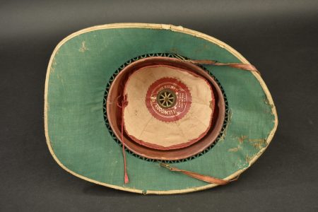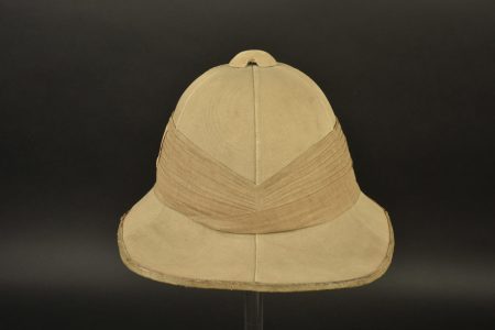 Casque colonial anglais. Casque en liège recouvert de toile beige, patch cousu sur un côté. Doublure en tissu vert, taille 6 7/8, marquage fabricant. Jugulaire en cuir brun complète mais... en savoir plus