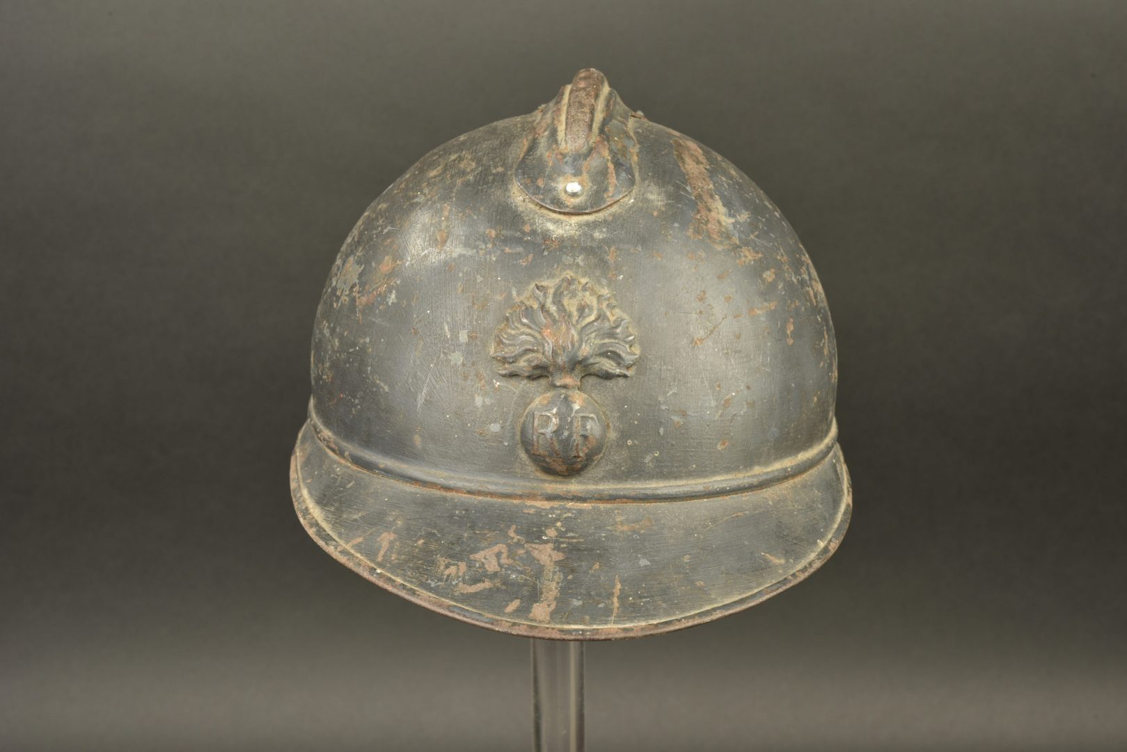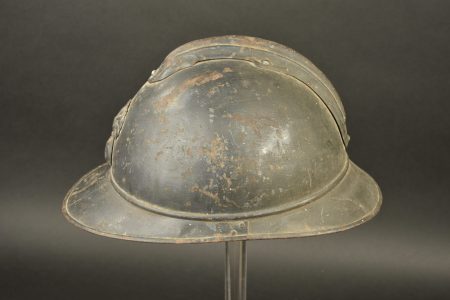 Casque Adrian 1915 infanterie. Peinture bleu nuit appliquée au pinceau, attribut modèle 1915 de l’infanterie. Coiffe en cuir du premier modèle, cuir sec et accidenté, jugulaire... en savoir plus