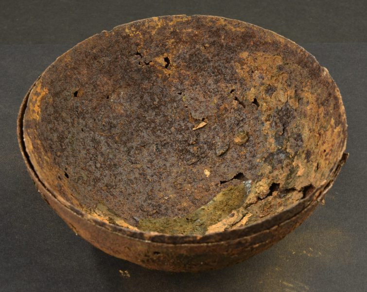 Ensemble de cervelières. Deux cervelières en métal fortement corrodées. Pièce de fouille trouvées ensemble sur Souchez, reliques de la bataille d’Artois.