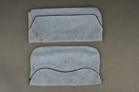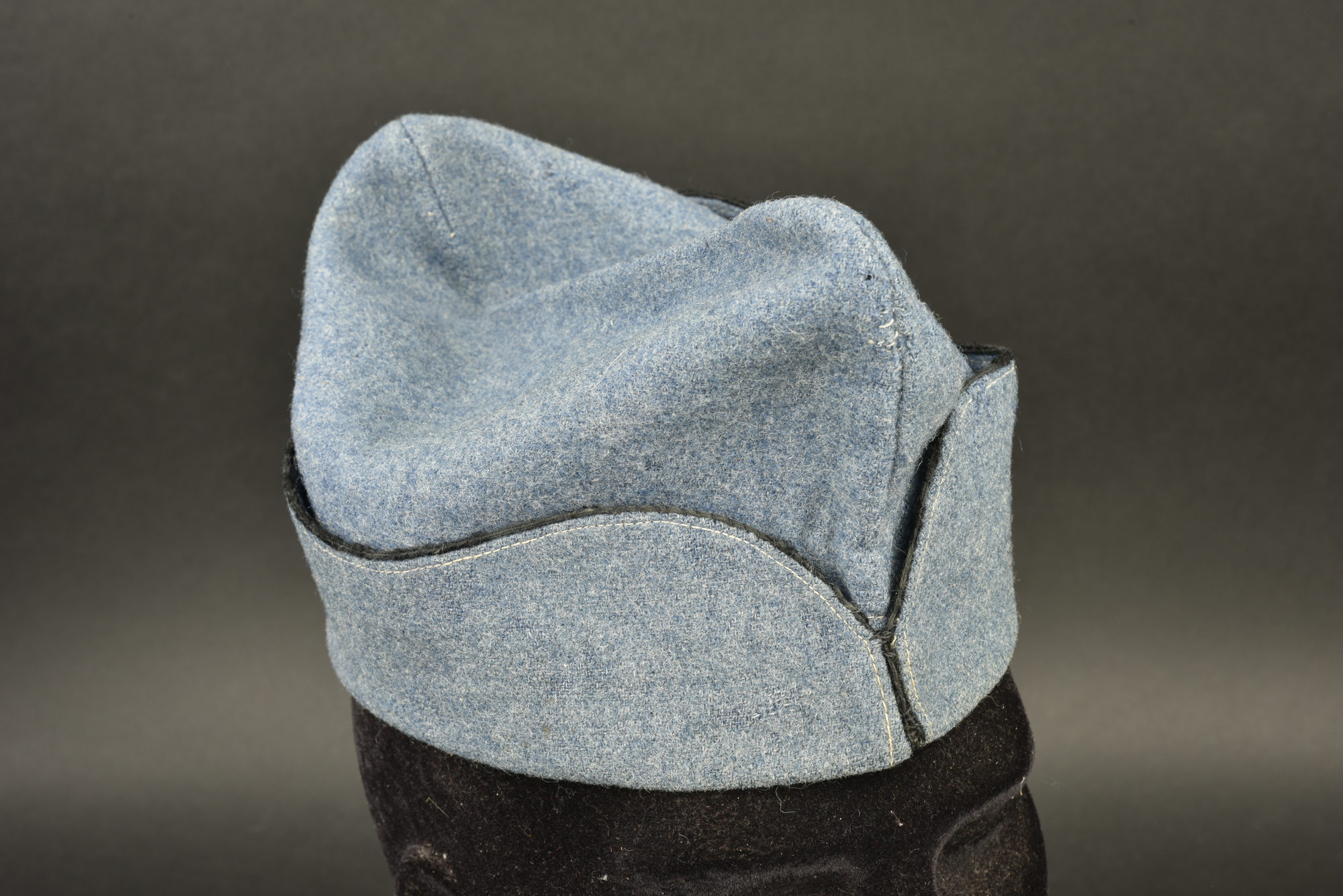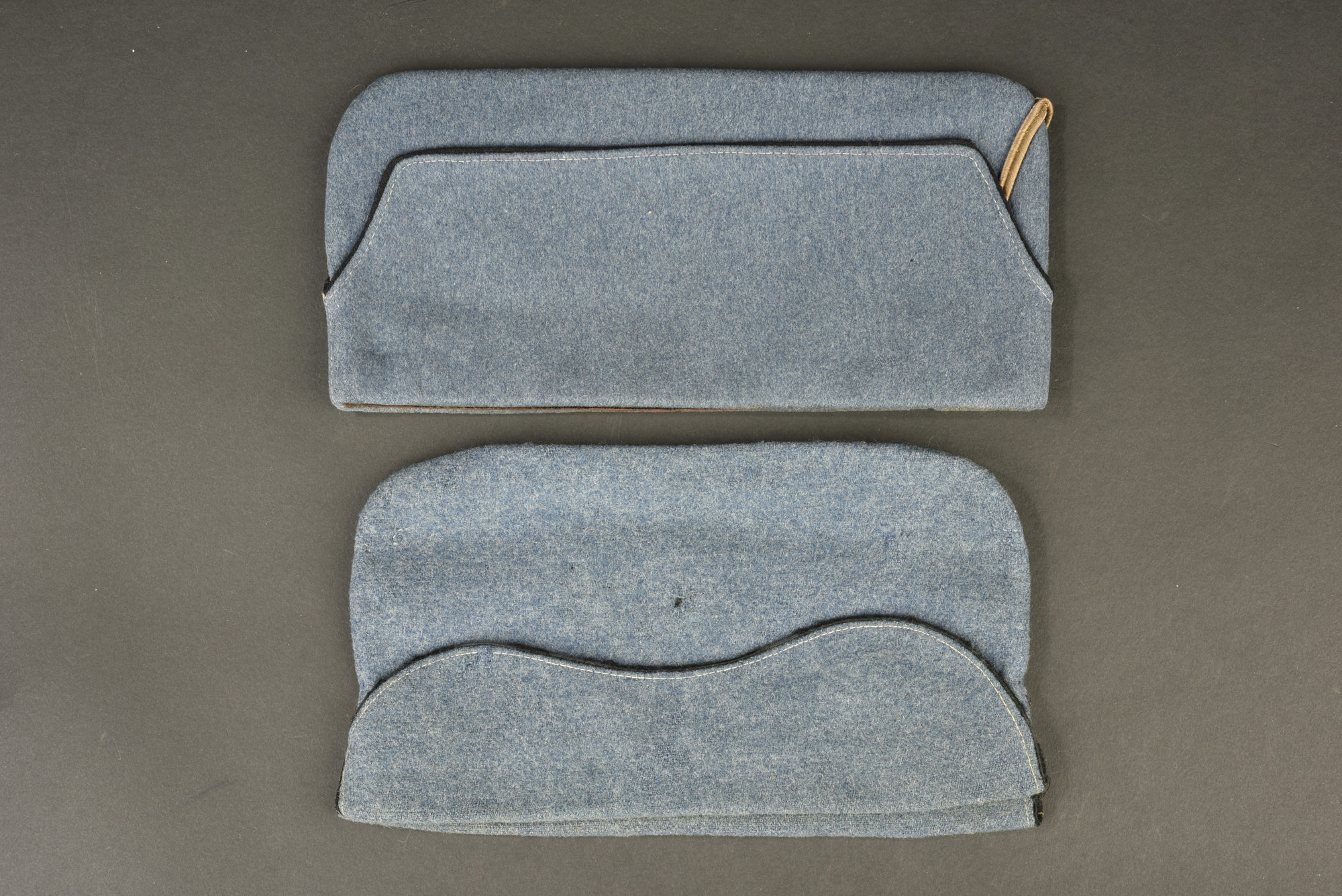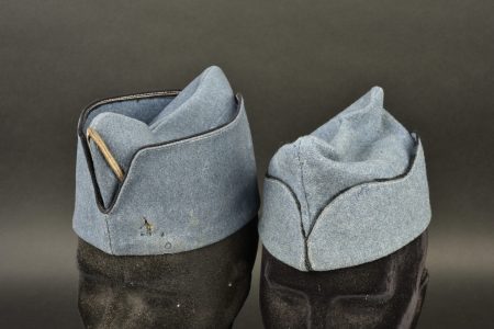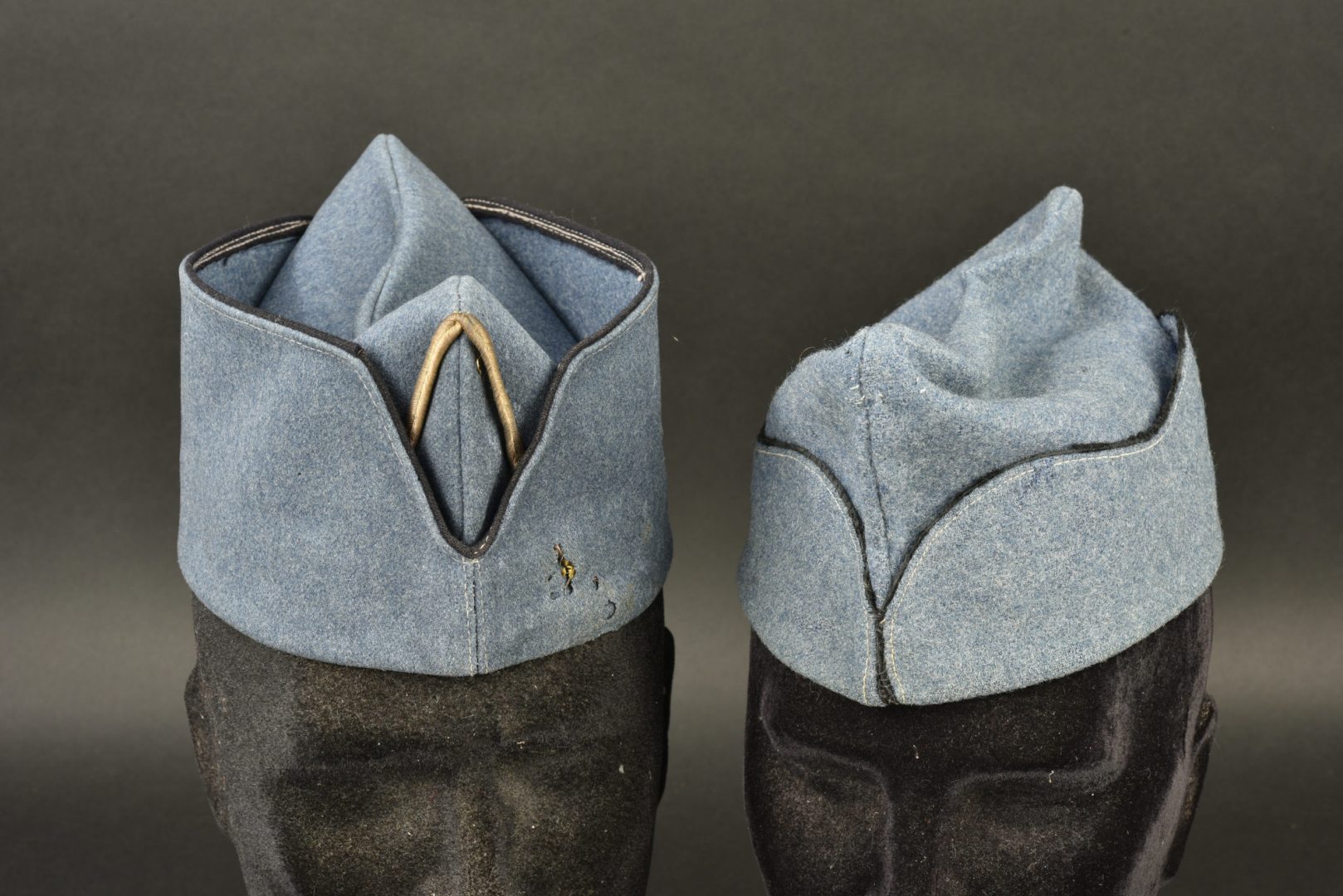 Ensemble de bonnets de police. Du Génie, en drap bleu horizon à passepoil noir, un grade dorée cousu, un avec doublure en satinette jaune et bandeau en cuir. Nombreux trous de mites.