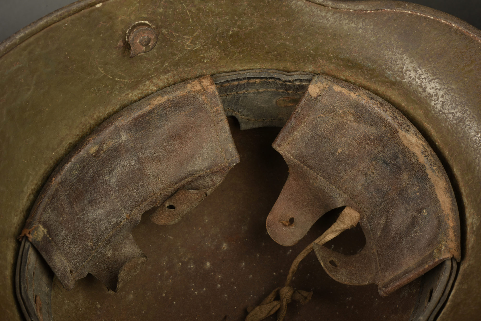 Casque allemand Stahlhelm 1916. Modèle 1916 avec cerclage en cuir, peinture d’usine épaisse à près de 70%,. Intérieur à trois coussinets en cuir brun (un incomplet),coussins absents.... en savoir plus