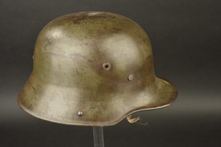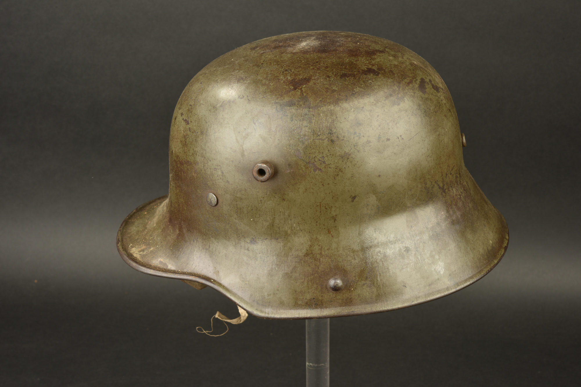 Casque allemand Stahlhelm 1916. Modèle 1916 avec cerclage en cuir, peinture à près de 70%, marquage Si66. Intérieur à trois coussinets en cuir brun, nombreux manques et déchirures, coussins... en savoir plus