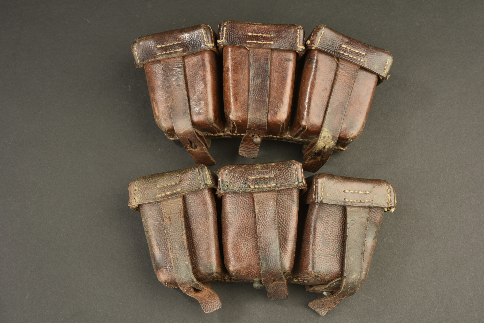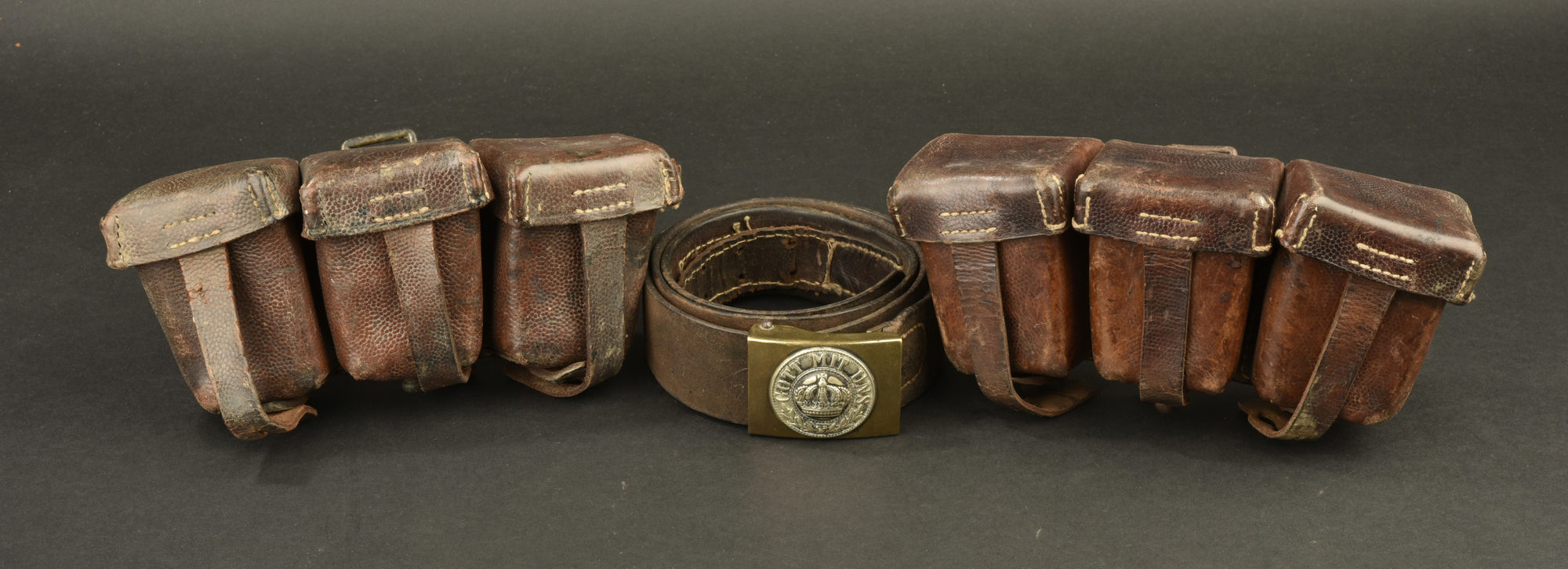 Ensemble d’équipements allemands. Comprenant un ceinturon prussien, boucle modèle 1895 en laiton, ceinturon en cuir, patelette décousue. Une paire de cartouchières en cuir fauve... en savoir plus
