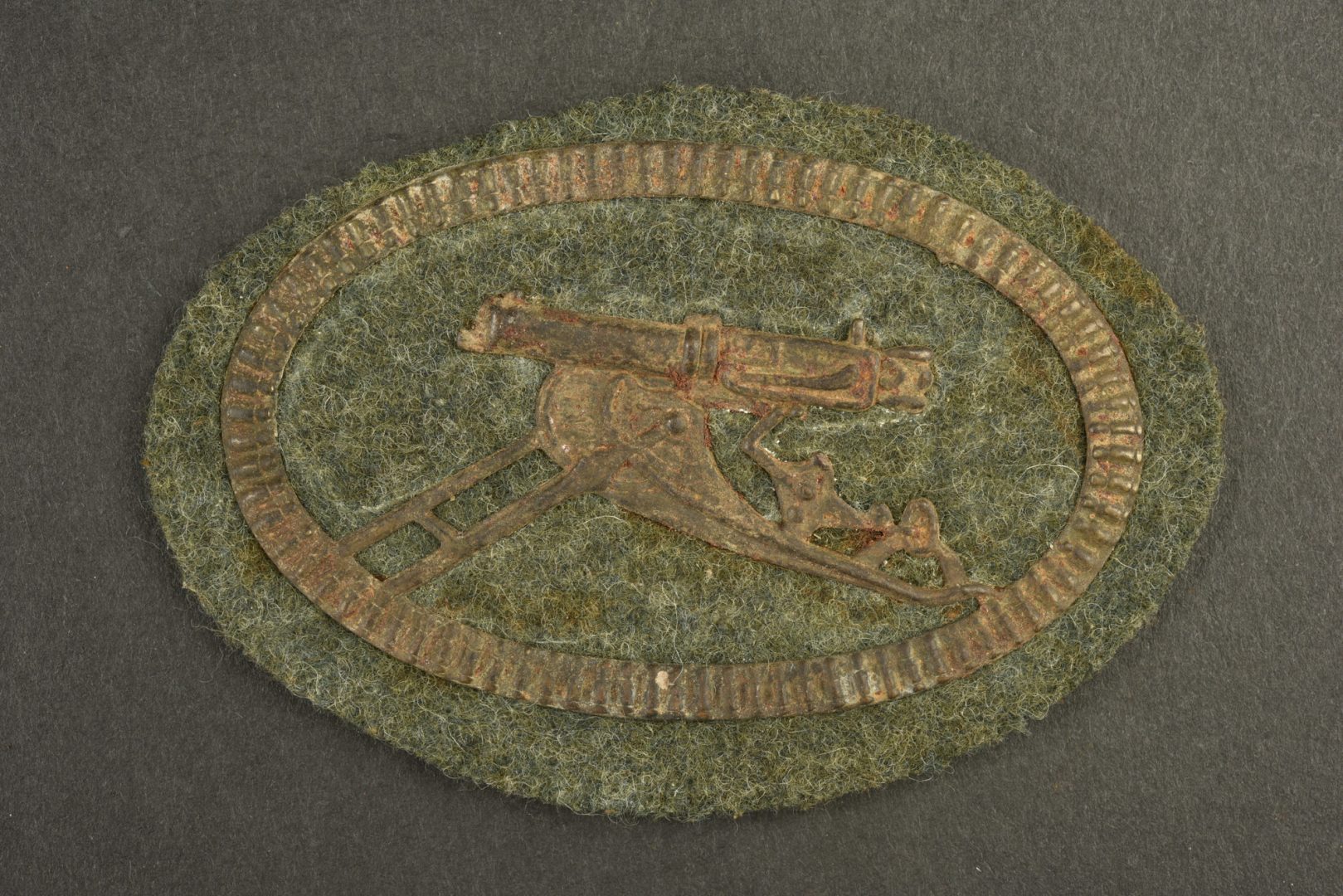 Insigne de spécialité mitrailleur. Insigne en métal embouti avec sa contre plaque, fixé sur une pièce de drap feldgrau.
