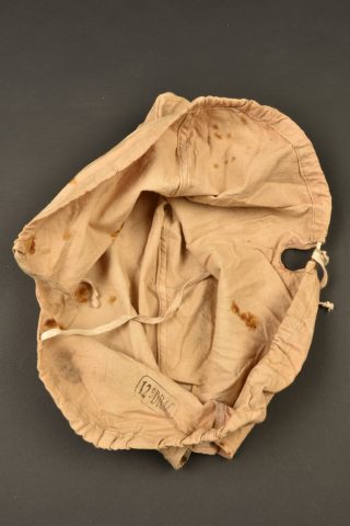 Ancienne reproduction de couvre casque de cavalerie. En fine toile de coton cachou, fermant par un lacet, tampon fantaisie du 12ème dragon, traces de rouille, belle patine.
