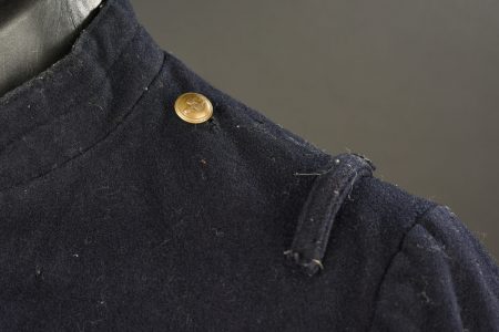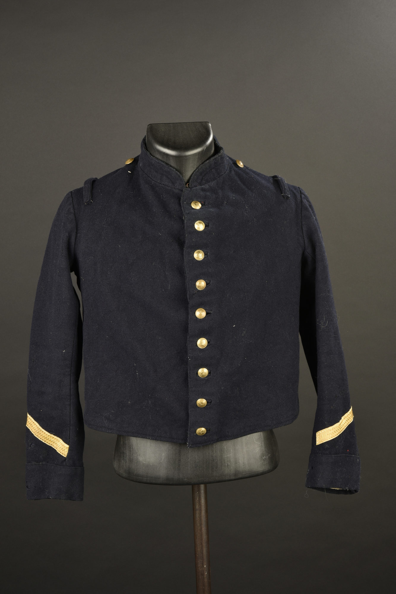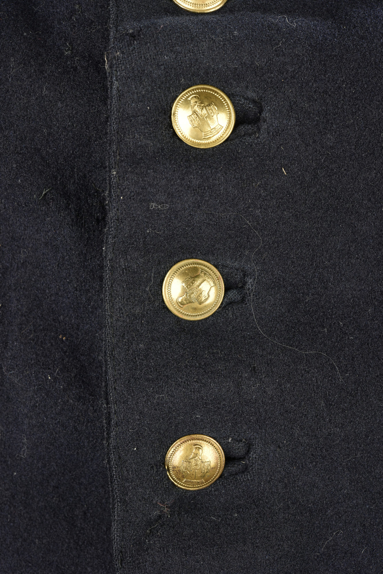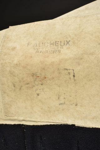 Veste ras de cul du Génie. En drap de laine bleu nuit, datée 1914, tampon de réception daté 1914. Doublure en drap écru, tampon de costumier sur celle-ci. Fermeture par neuf boutons aux armes... en savoir plus