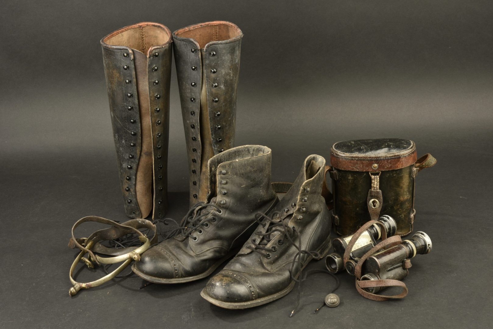 Ensemble d’équipement d’officier, souliers, jambières, jumelles et éperons. Jumelles Huet d’officier avec tables de distances illustrées d’un fantassin et d’un... en savoir plus
