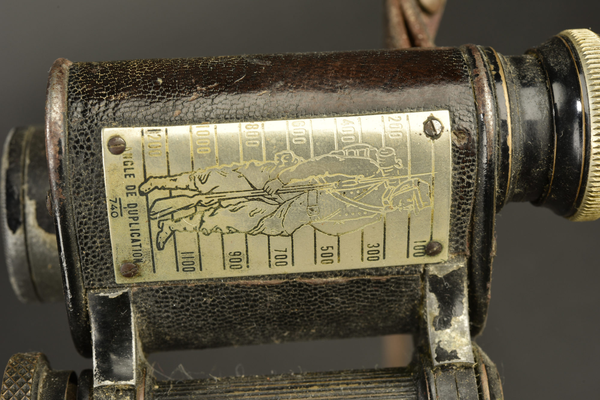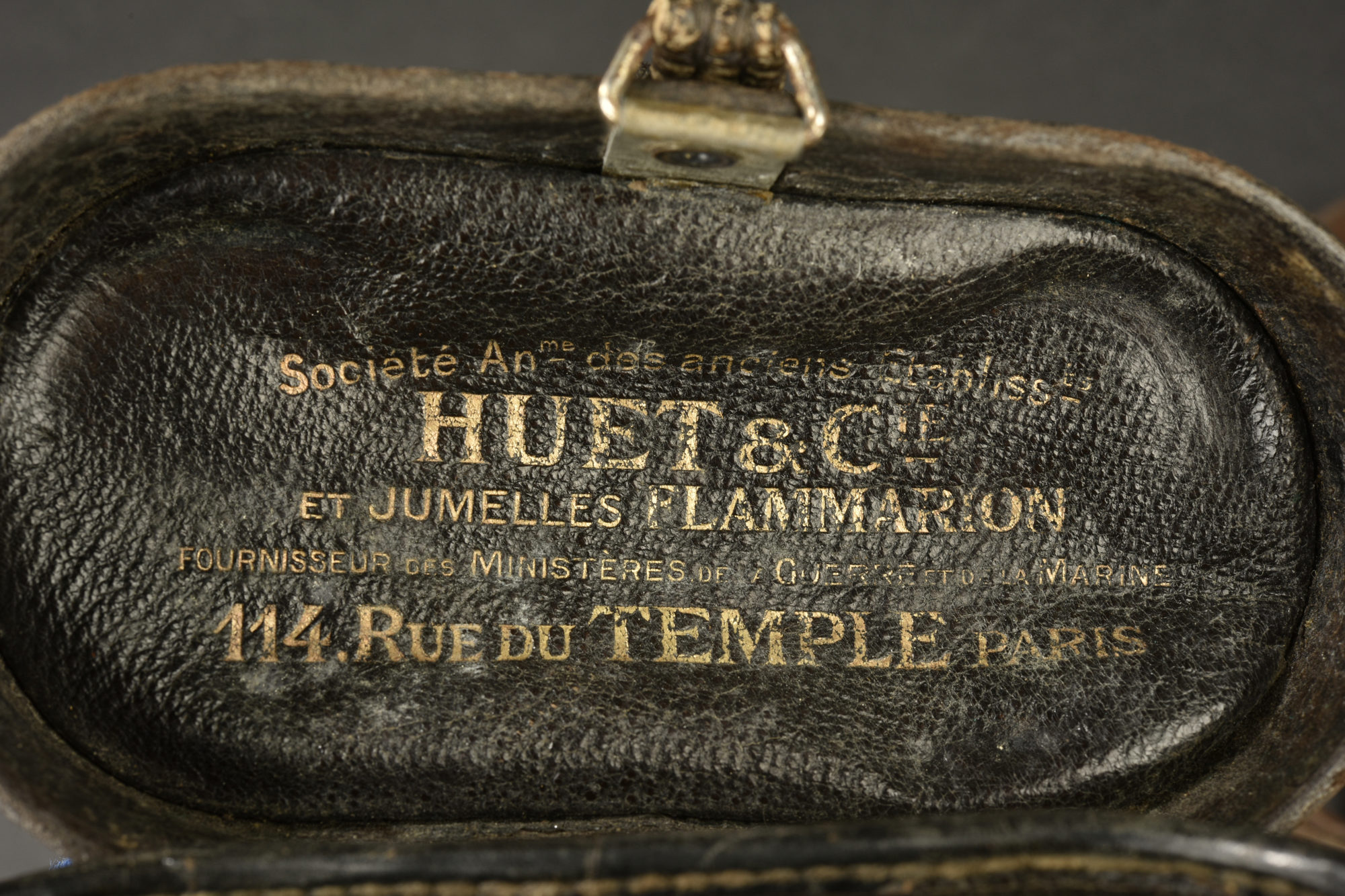 Ensemble d’équipement d’officier, souliers, jambières, jumelles et éperons. Jumelles Huet d’officier avec tables de distances illustrées d’un fantassin et d’un cavalier, dans leur étui cuir de la maison Huet. Paire de souliers en cuir noirci. Paire de jambières en cuir noirci avec leurs lacets. Une paire d’éperons dont l’un avec un sanglon manquant et un bouton d’officier à la grenade. Usure d’usage et patine.