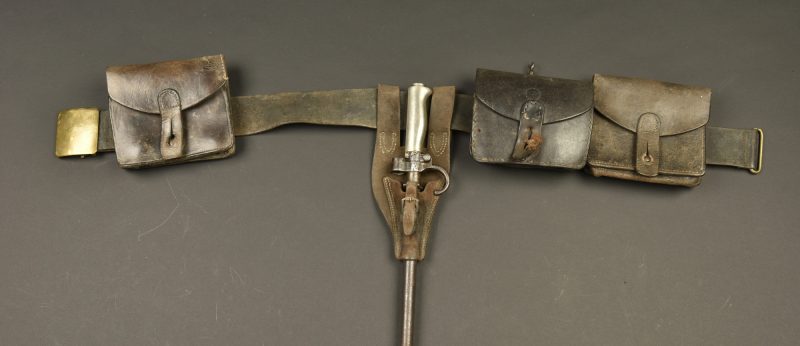 Lot ceinturon M1845, cartouchière M1888 et épée baïonnette M1886 de poilu. Ceinturon modèle 1845 en cuir retourné, marquage manuscrit à la peinture noire au 42e d’infanterie avec... en savoir plus