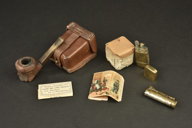 Lot d’objets du fumeur de Poilu. Comprenant une pipe dont le fourneau en bois sculpté figure un cavalier d’Afrique, un paquet de tabac Scaferlati 40 grammes à 9 francs le paquet,... en savoir plus