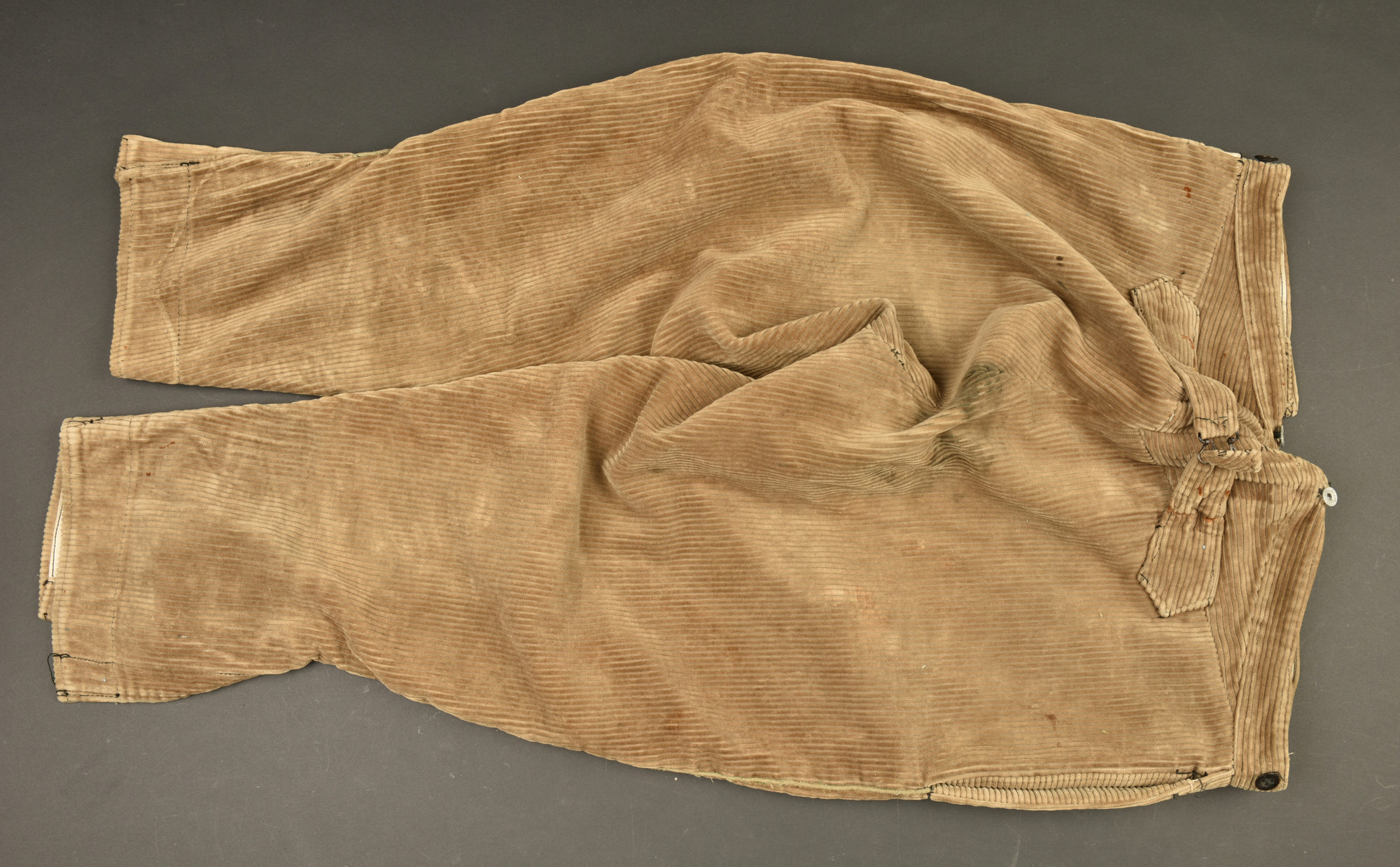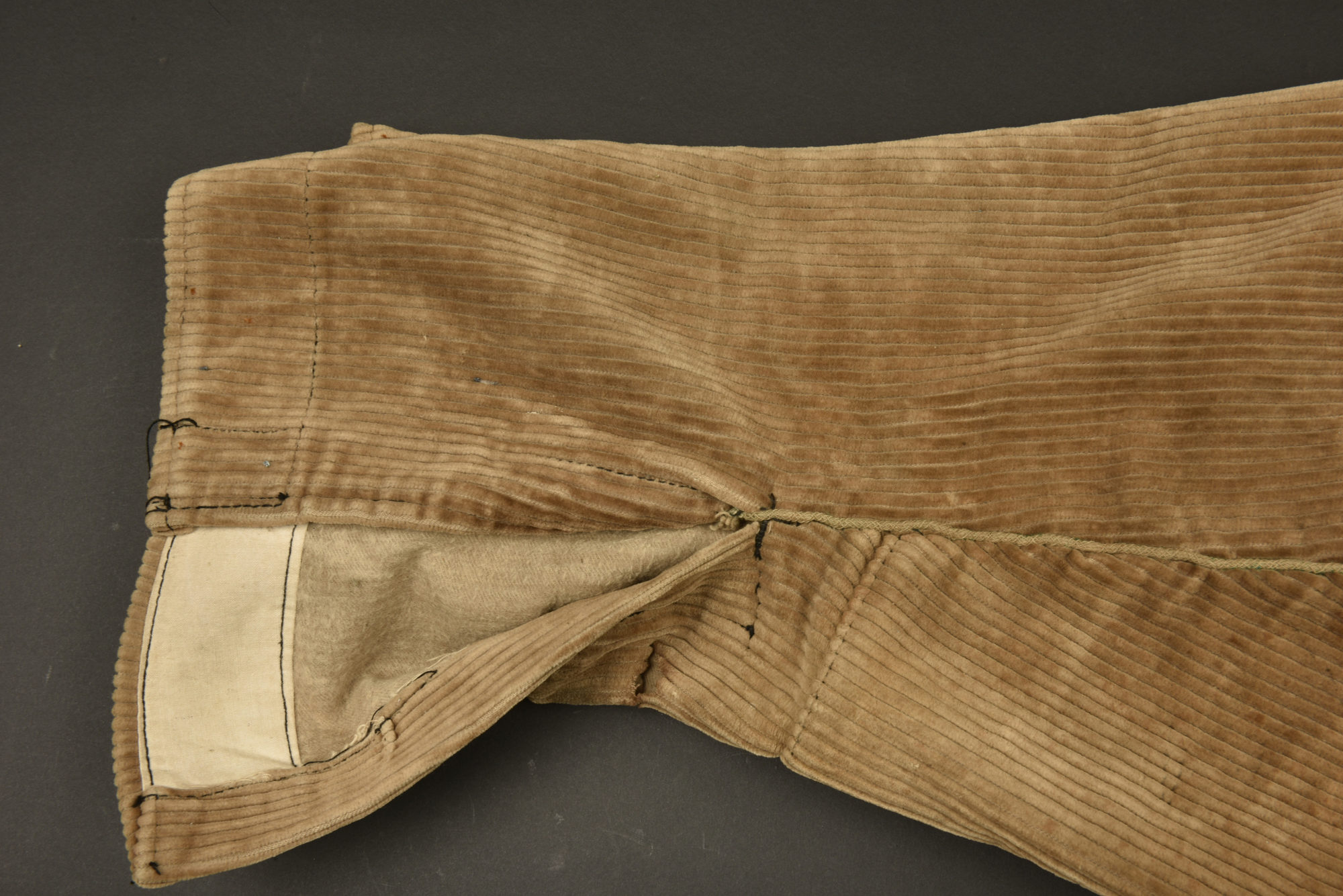 Pantalon culotte modèle 1914 de circonstance en velours côtelé à passepoil vert. Pantalon culotte modèle 1914, confection de circonstance en velours côtelé marron clair. Renforts aux... en savoir plus