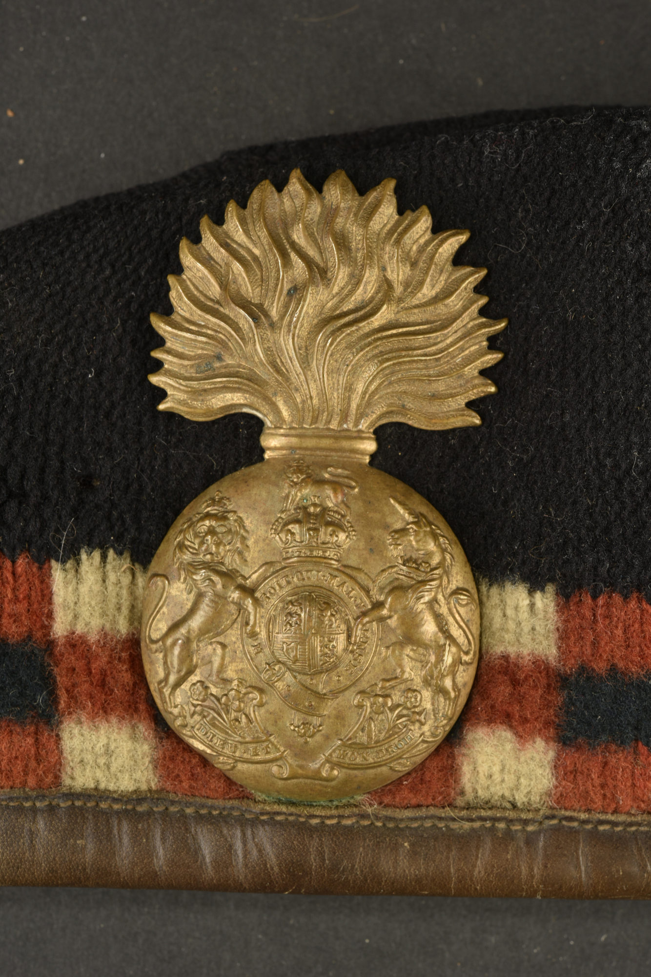 Bonnet Glengarry d’un Royal Scots Fusilier. Bon Glengarry de la 1ère guerre, en drap bleu foncé presque noir avec damier Noir, rouge et blanc et son pompon écarlate. Rubans absents.... en savoir plus