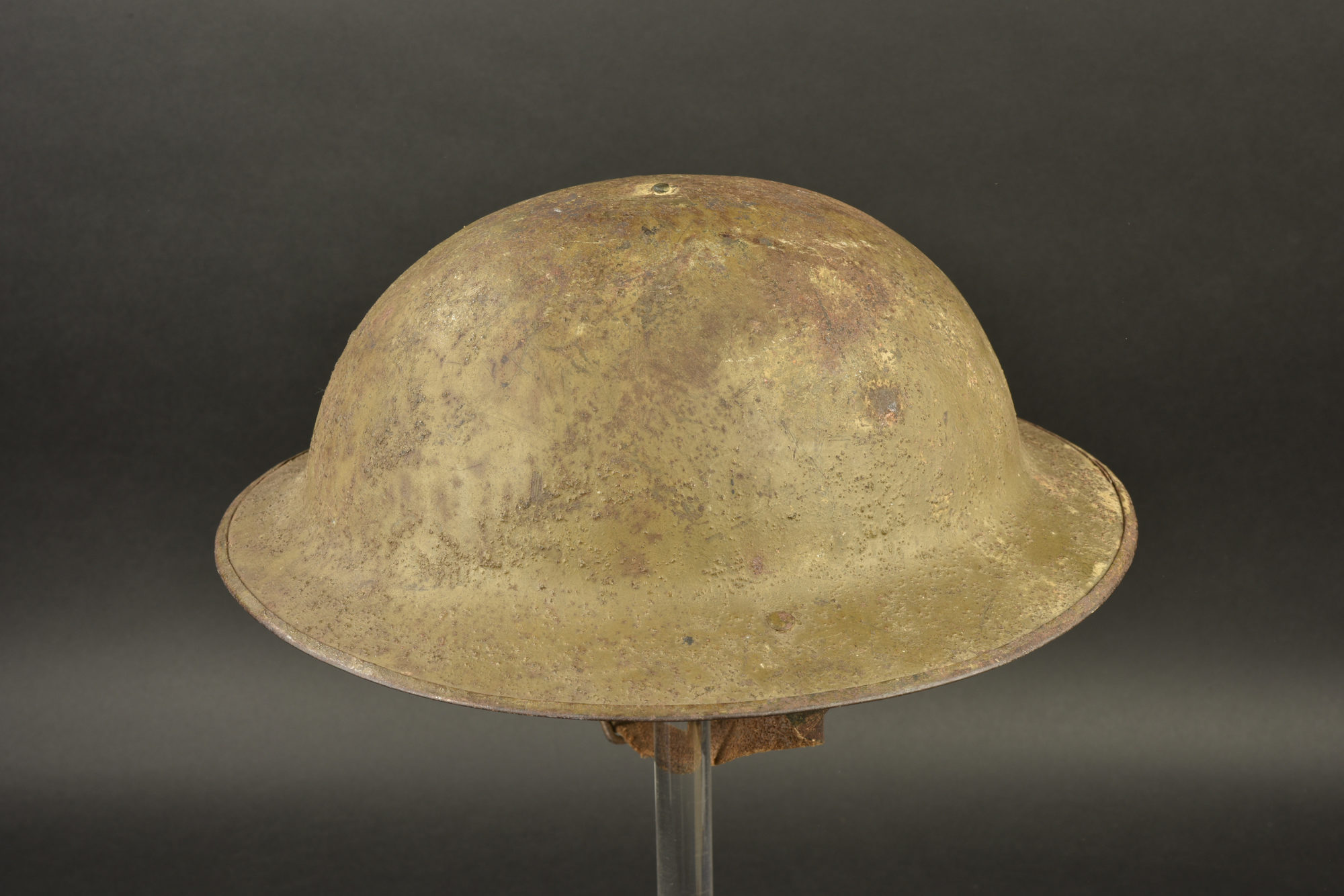 Casque MkI anglais de la 1ere guerre. Belle coque en peinture Kaki texturée. Marquages fabricant non visibles. Belle coiffe du 2nd type, en toile cirée, tampon à l’encre rouge dessous,... en savoir plus