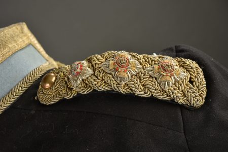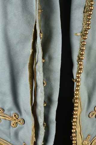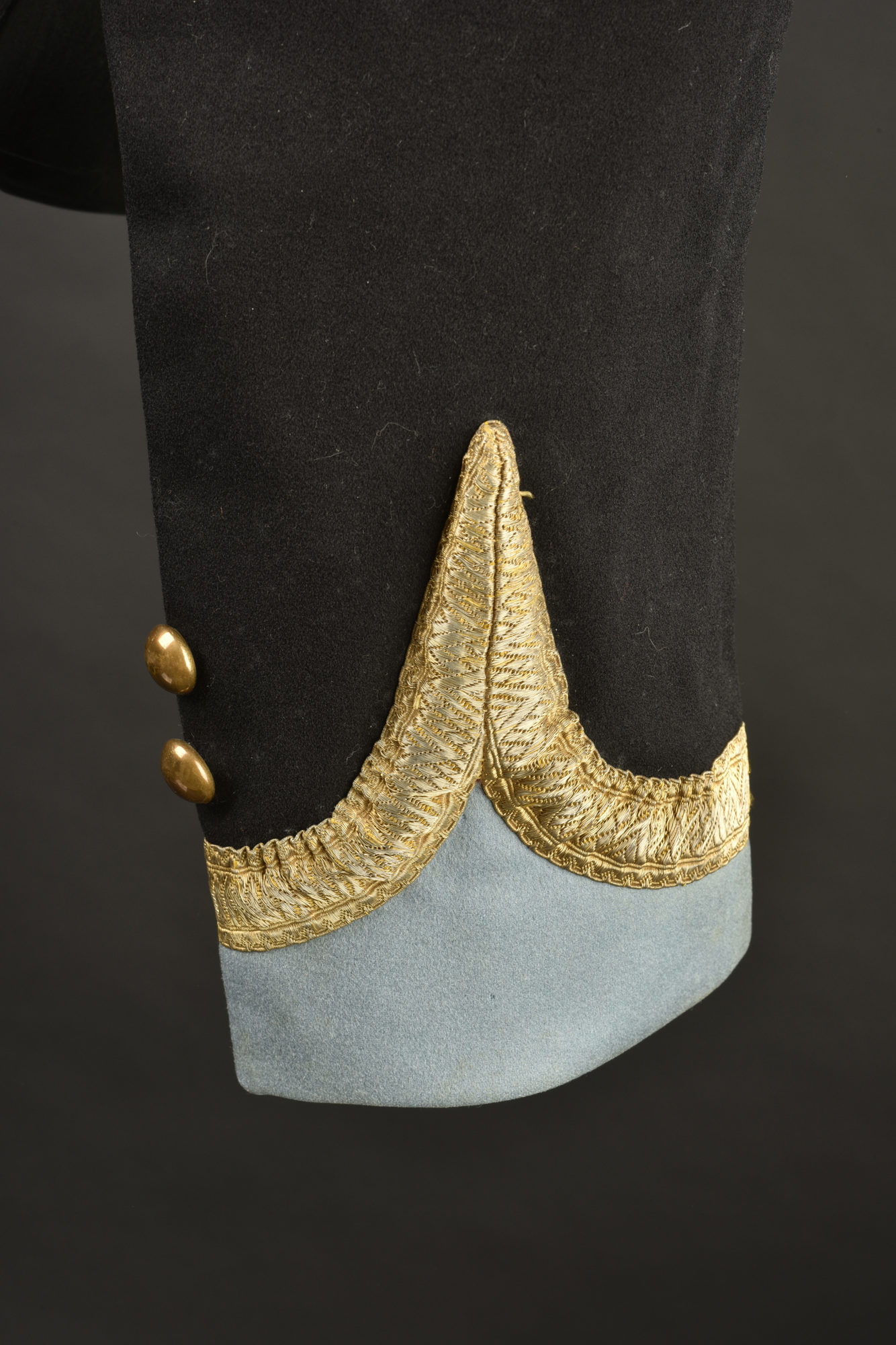 Ensemble habit de mess du Captain Georges Kirkbride du 34th Poona Horse en France en 1915. Comprenant un habit en drap noir bordé d’un large galon lézarde doré, fermant par crochets, avec... en savoir plus