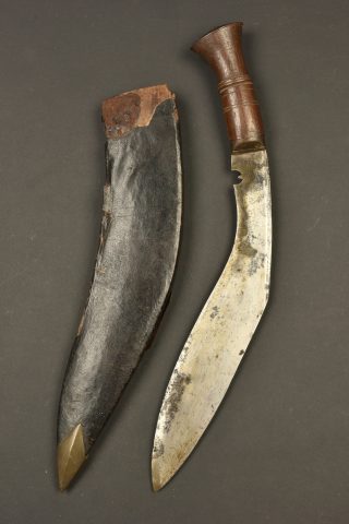 Kukri avec fourreau et livret de caricatures humoristiques de l’armée des Indes. Kukri non marqué mais de très bonne et ancienne facture, légèrement plus petit que les modèles règlementaires. Avec un fourreau en bois recouvert de cuir, en mauvais état. Renforcé d’une bouterole en laiton. On y joint un livret de caricatures humoristiques sur l’armée des Indes, l’A.B.C. of the Indian Army, dédicacé par un soldat à un autre en 1917. Usure, taches d’encres.