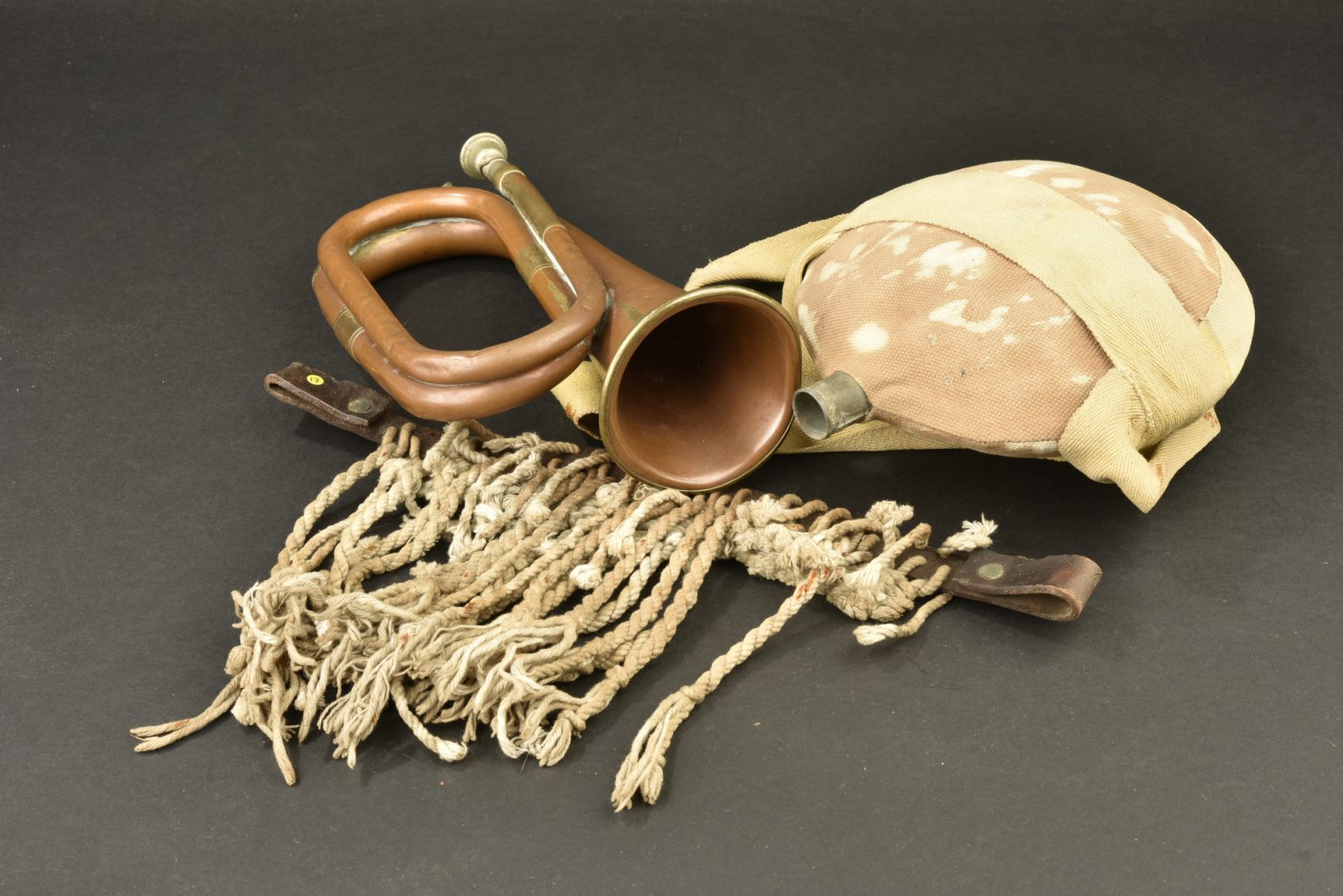 Lot d’objets de troupes montées de l’armée des Indes. Composé d’un bidon de cavalerie indienne en fer étamé, bouchon manquant, recouvert de sa housse en toile, traces de décoloration sans doute eau de javel, et de son harnais avec sangle de portage, taches de rouille. Un frontal anti-mouches pour chevaux ou mules, composé d’un bandeau cuir, bien marqué HGR16 avec des cordelettes de coton blanc. Etat moyen. Et un bugle en cuivre et laiton, bien marqué d’un fabricant de Bombay. Usure et patine.